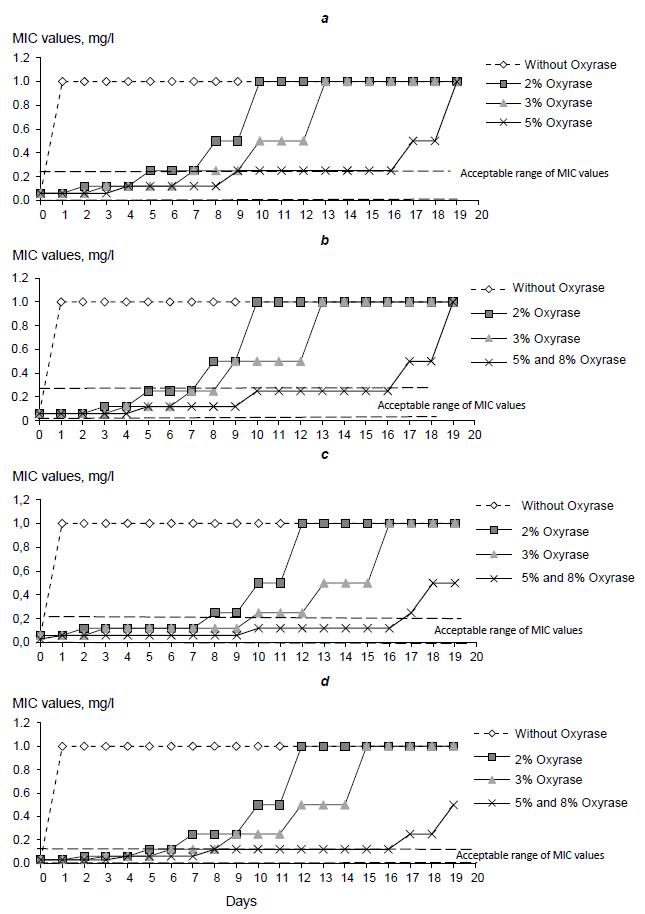 The dependence of tigecycline MIC for E. coli ATCC 25922 (a), S. aureus ATCC 29213 (b), E. faecalis ATCC 29212 (c), and S. pneumoniae ATCC 49619 (d) on the concentration of Oxyrase added to the antibiotic stock solutions and their storage periods at 2–6°C.