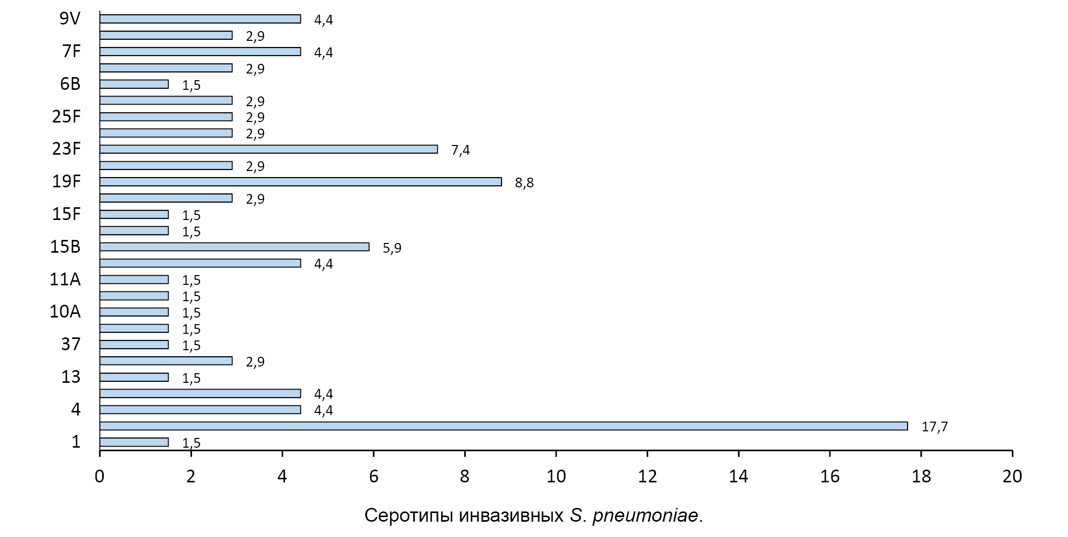 - 28 global pneumococcal sequence clusters (GPSC) and 45 S. pneumoniae sequence-types associated with invasive strains were identified in Russia. Of 68 S. pneumoniae isolates from patients with bacterial meningitis, more than 17% belonged to non-vaccine serotypes.