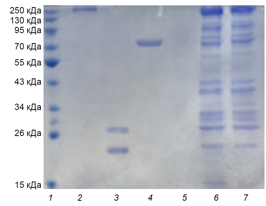 3. Fig. 1. Electrophoresis in PAAG from antigenic complexes of biofilm and planktonic cultures of B. pertussis. The tracks on the electrophoregram are: 1 — molecular weight markers; 2 — FHA; 3 — PT; 4 — PRN; 5 — LPS; 6 — AC strain No. 317 (biofilm culture); 7 — AC strain No. 317 (planktonic culture).