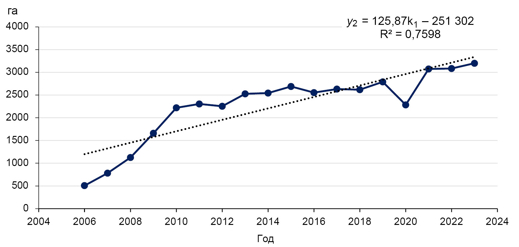 The area of acaricide treatments in 2010 compared to 2006 increased 4.4 times — from 507 to 2220.5 ha [9]. Our statistical analysis for 2006–2023 showed that the volume of acaricide treatments in the Kirov region increased annually by an average of 125.87 ha. We found a negative reliable correlation of moderate closeness between Lyme disease incidence in 2006–2023 and the volume of acaricide treatments during this period.