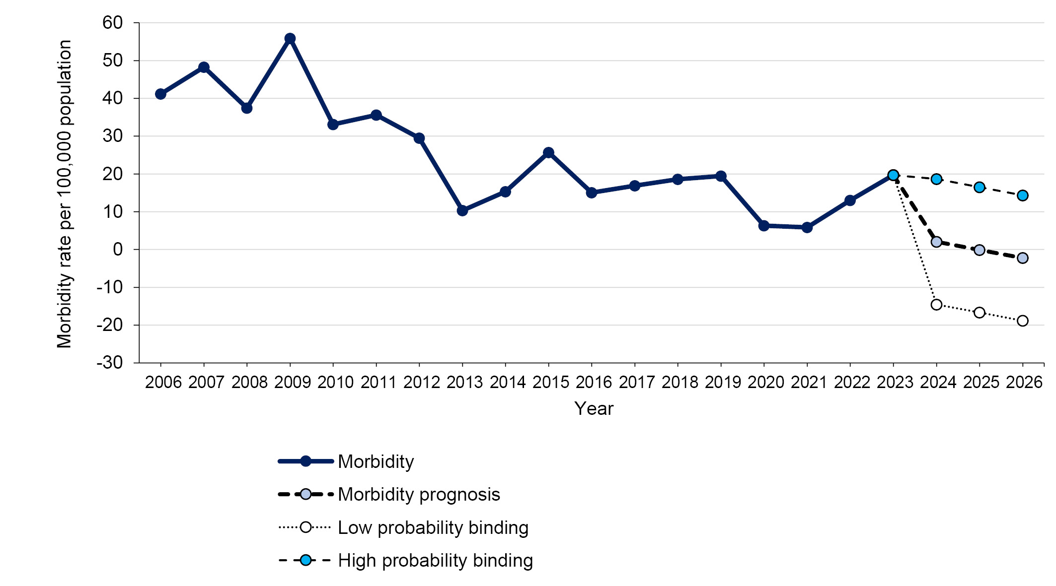 Fig. 2. Interval forecast chart for the Lyme disease incidence in the Kirov region until 2026.