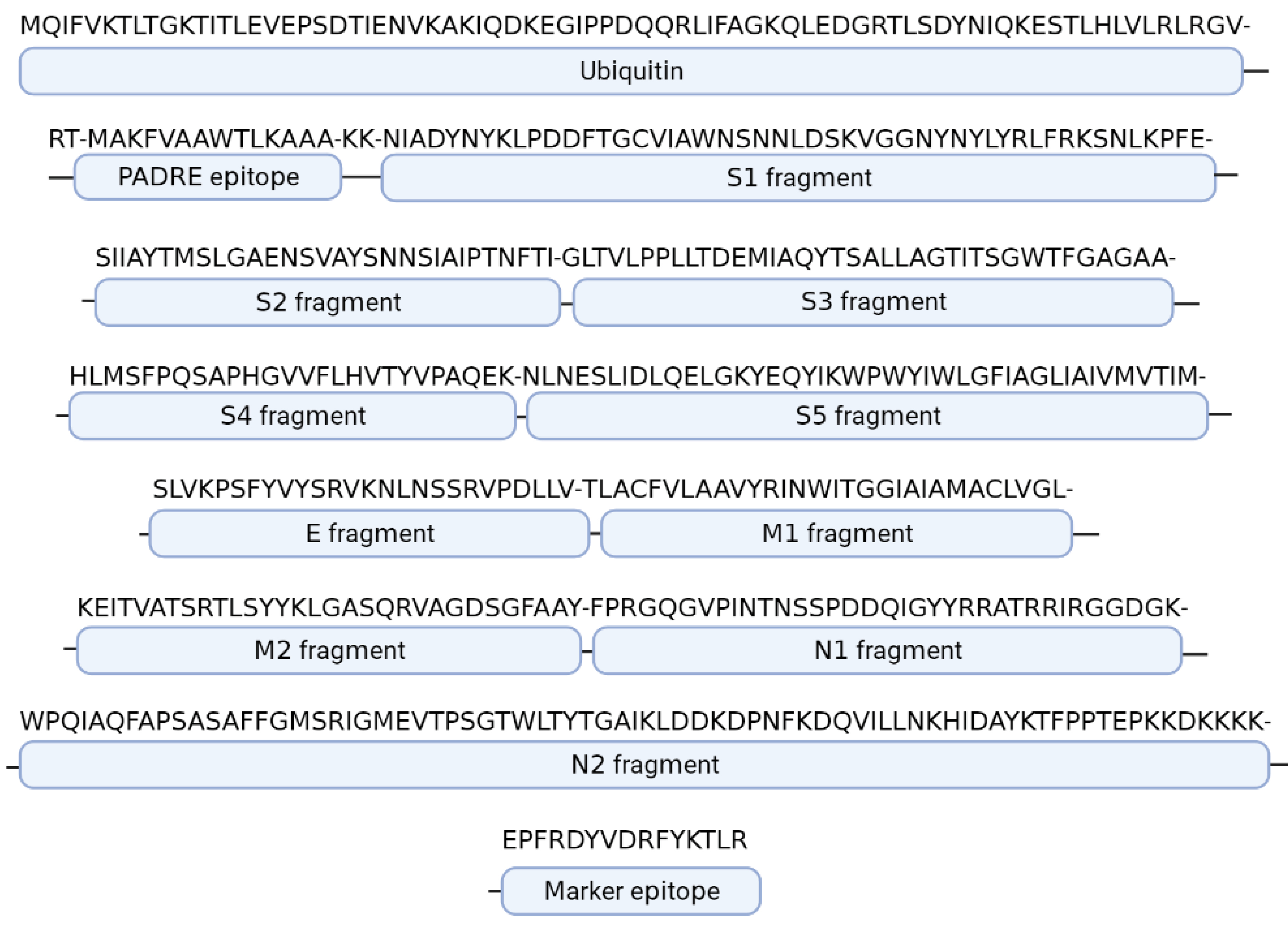 Fig. 1. Schematic representation of the artificial polyepitopic T-cell immunogen BSI-COV-Ub, composed of fragments of SARS-CoV-2 virus proteins