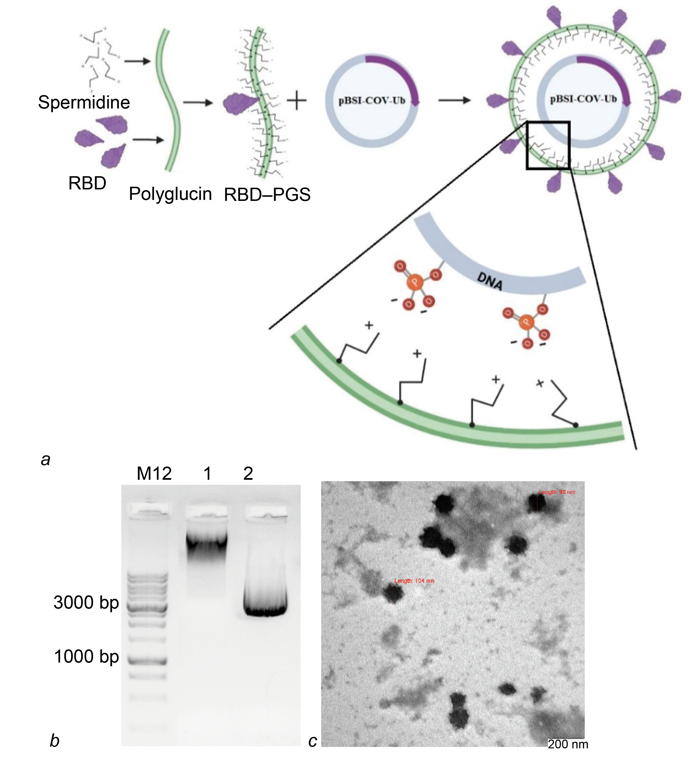 b — confirmation of DNA encapsulation within the RBD–PGS shell by electrophoresis in a 1% agarose gel: 1 — CCV–BSI; 2 — pBSI-COV-Ub.