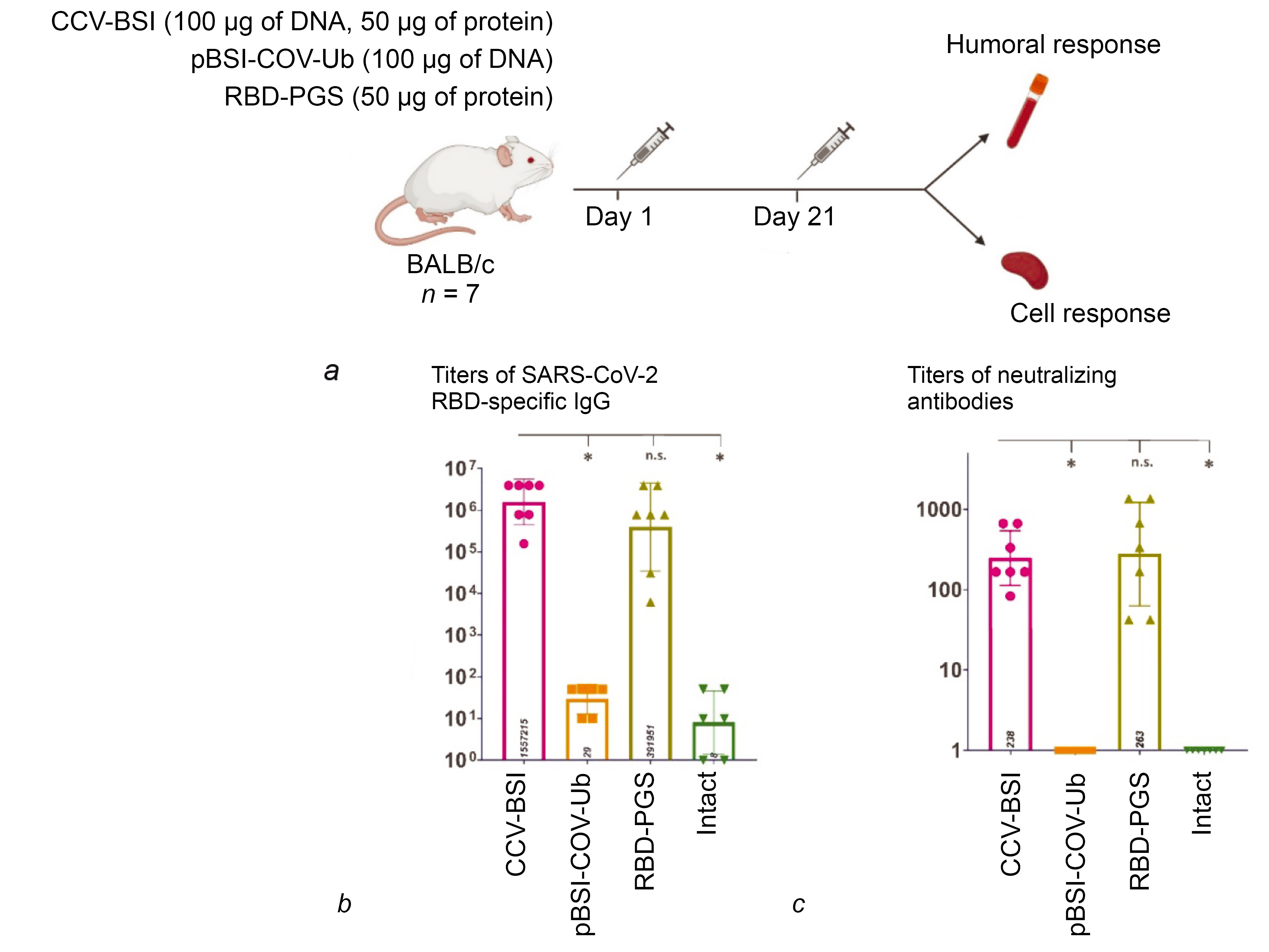 The results of the serum neutralization analysis using the nCoV/Victoria/1/2020 strain of the SARS-CoV-2 virus on cell culture in vitro also showed no significant differences between the groups immunized with the CCV–BSI combined construct and the RBD protein conjugated to PGS: the mean neutralizing titers were 1:238 and 1 : 263, respectively (p = 0.7780). Animal sera from those who received only the pBSI-COV-Ub plasmid and sera from intact animals did not show virus-neutralizing activity (Fig. 4, c).