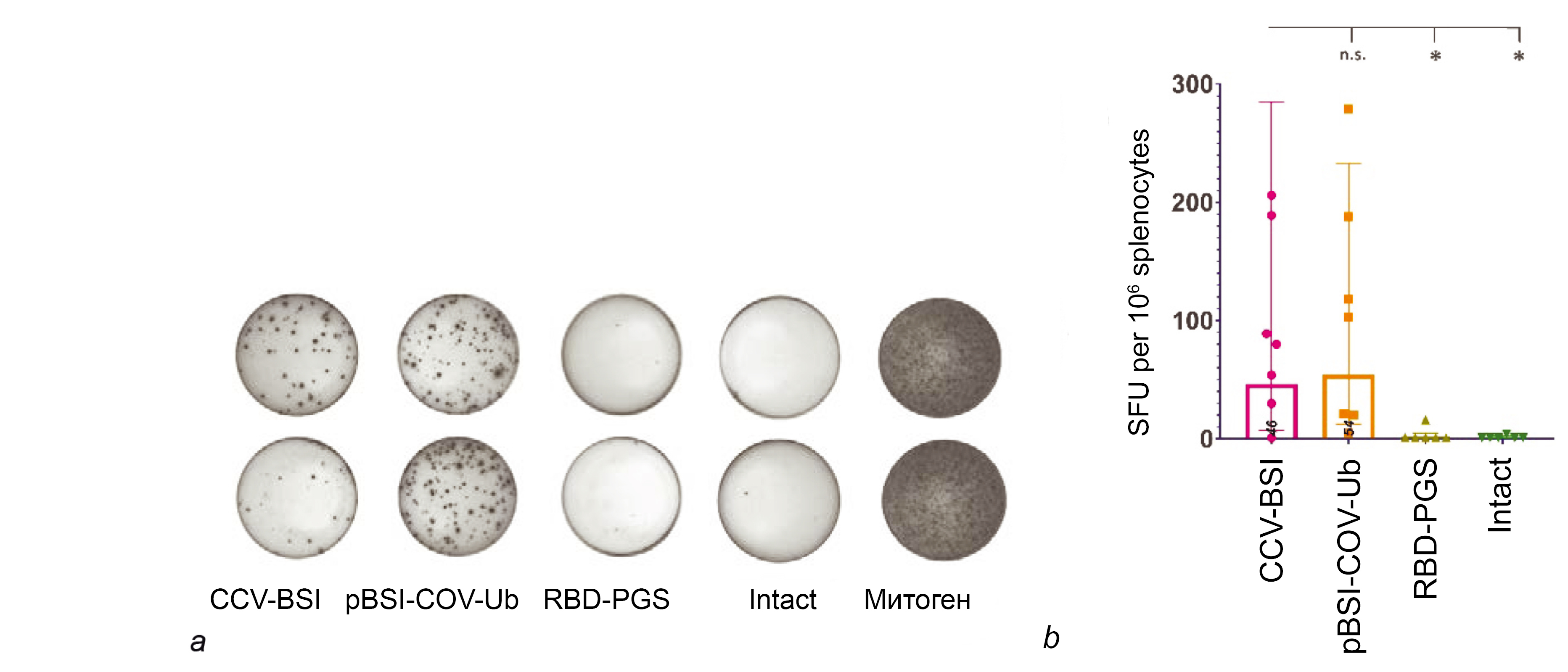 b — number of splenocytes releasing interferon-γ in response to specific stimulation with peptides from the RBD protein and the artificial BSI-COV-Ub immunogen, counted using ELISpot. Data are presented as geometric means with geometric standard deviation, individual values are marked with dots. The significance of the differences between the groups was calculated using the non-parametric Mann–Whitney method (*p < 0.01, **p < 0.05, n.s. — statistically non-significant).