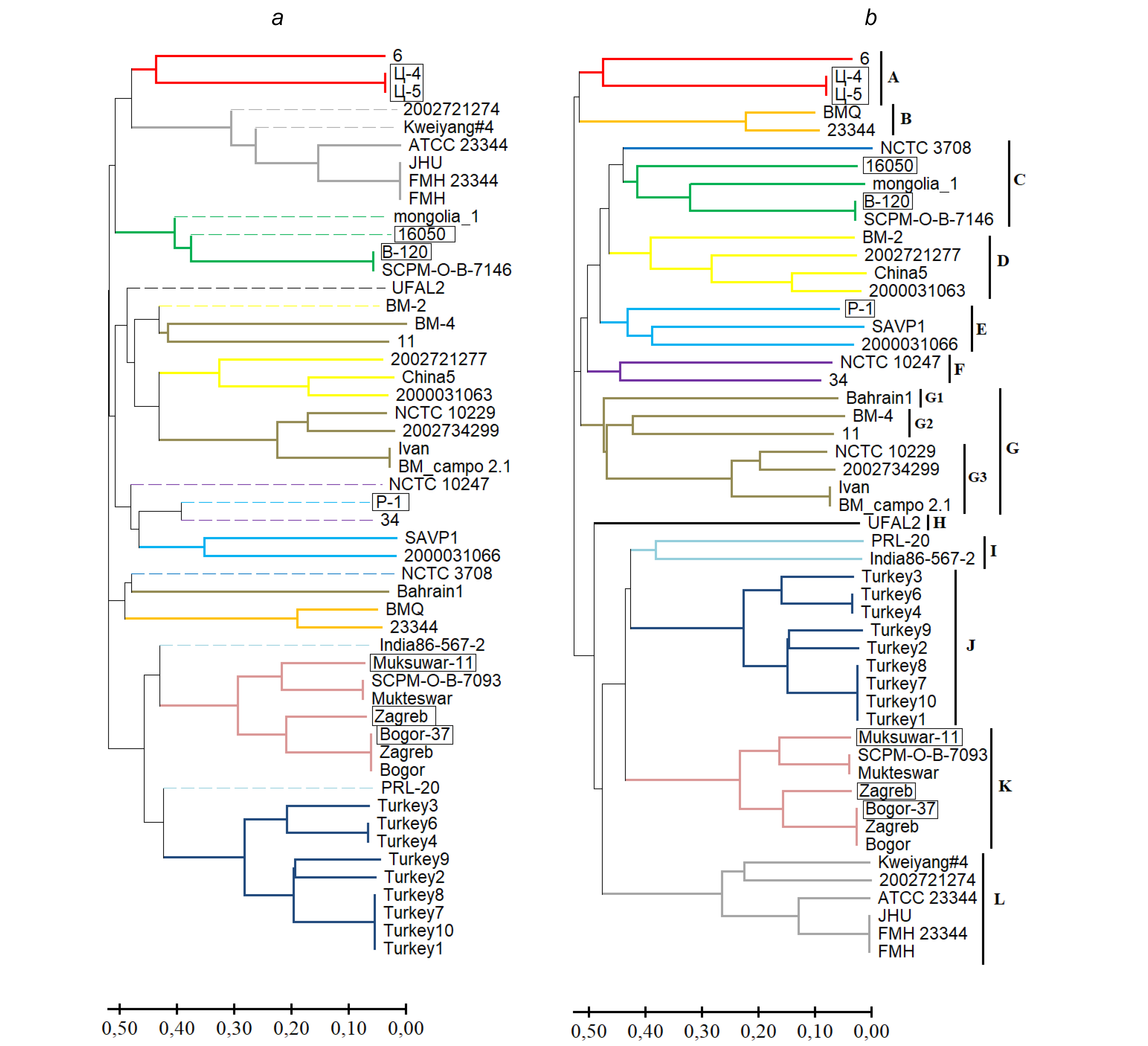 Identical root clusters are marked in the same color. a: Strains whose positions changed upon inclusion of the BPSS1974#I locus are marked with a dashed line. The strains from the collection of the Volgograd Plague Control Research Institute are highlighted by a frame
