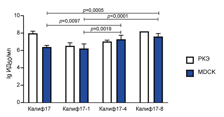 The growth capacity of three MDCK-adapted variants (Calif17-1, Calif17-4, and Calif17-8) with different sets of found mutations were studied in eggs and MDCK cells in comparison with the original virus propagated in eggs (Calif17). Reproduction of the original Calif17 vaccine strain on different substrates also differed by almost two orders of magnitude: the virus titer in eggs was 8.0 lg EID50/ml, while the virus titer in MDCK cells was 6.3 lg TCID50/ml (Fig. 2). In the study of MDCK-adapted variants of the Calif17 strain, a reliable increase in virus titers in MDCK cell culture by more than 10 times was found in 2 strains (Calif17-4 — 7.3 lg TCID50/ml and Calif17-8 — 7.6 lg TCID50/ml), both containing the A44V mutation in HA2. The Calif17-8 variant also retained a high level of reproduction in embryonated chicken eggs (8.2 lg EID50/ml), while the Calif17-1 strain, which has only the N156D mutation in HA1, did not improve reproduction in cell culture and decreased it in eggs by more than 30 times (6.2 lg TCID50/ml and 6.6 log EID50/ml). Thus, the A44V mutation in HA2 has a positive effect on the replication of the H1N1pdm09 vaccine strain in both culture systems.