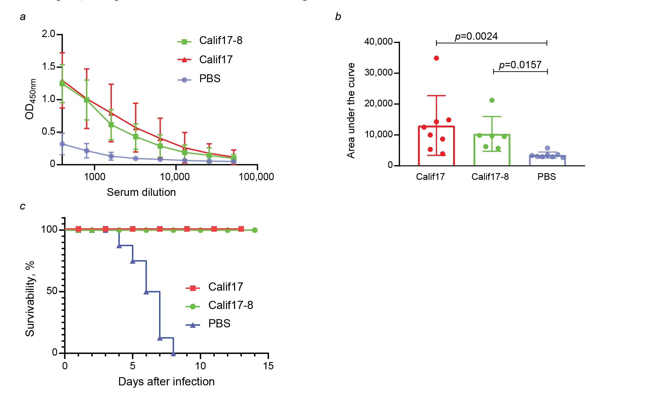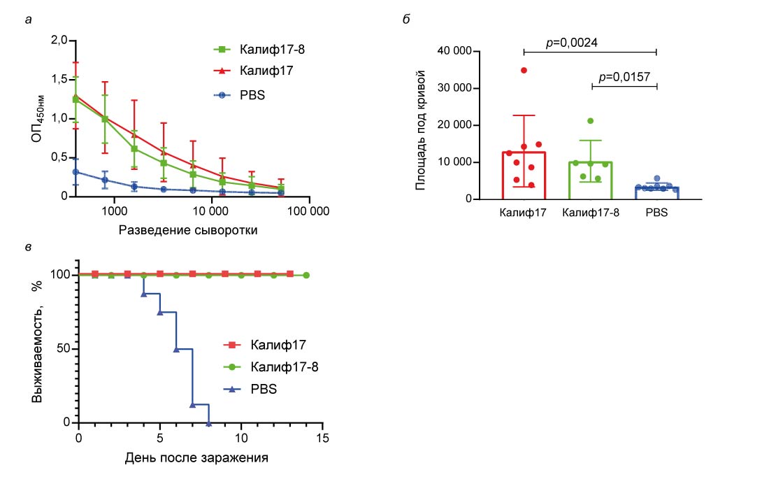 a — dependence of optical density on serum dilution in ELISA; b — calculation of the area under the curve according to the data of graph a; c — survival rate of immunized and control mice after experimental infection with the lethal virus A/California/09/07 MA.