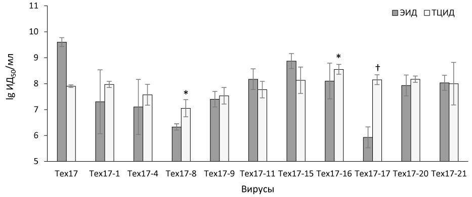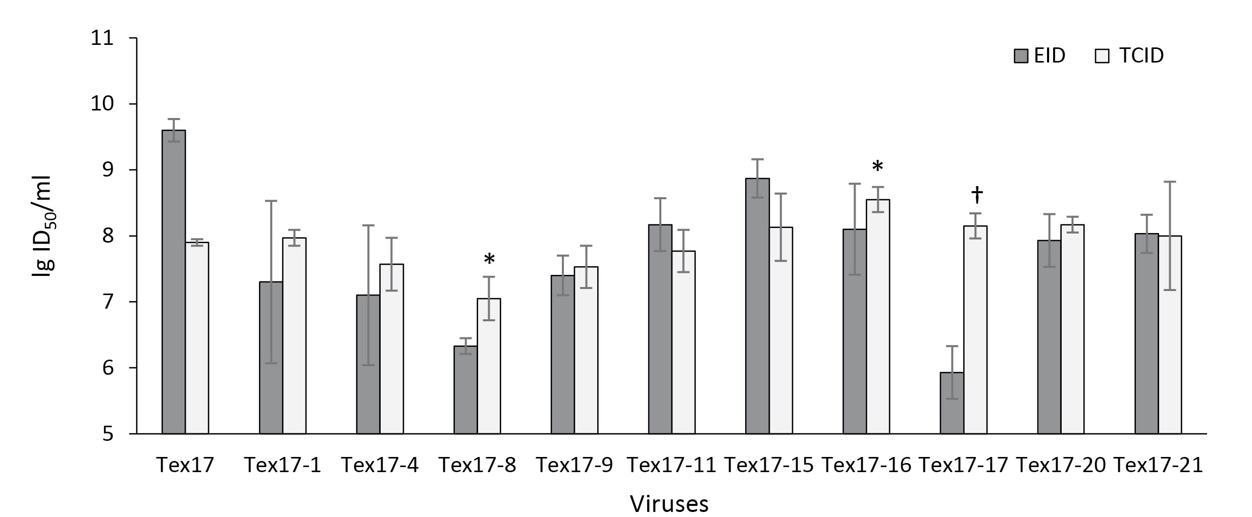 *p < 0.05 compared with TCID50/ml Tex17; †p < 0.05 compared with EID50/ml Tex17-17.