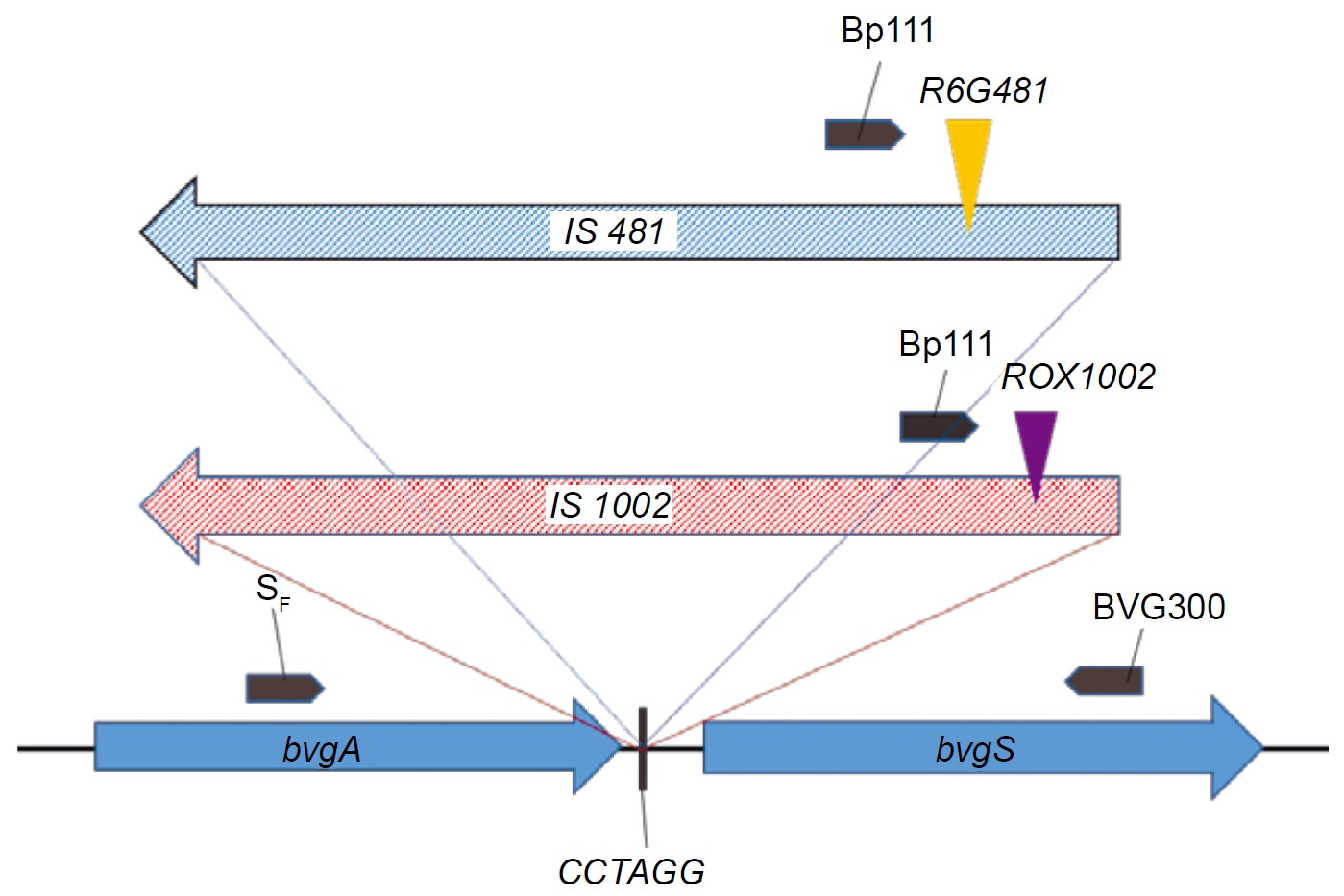 Among the described mutations in the virulence genes of the whooping cough pathogen, insertion mutations — the integration of IS elements into the specific site of the B. pertussis bvgAS operon — deserve special attention, according to our hypothesis. In previous studies, we described a method and test systems for detecting mutations in the bvgAS operon, which contains IS elements 481 and 1002 integrated in a specific, at that time the only known, orientation, which we conditionally designated as orientation (1) [13].