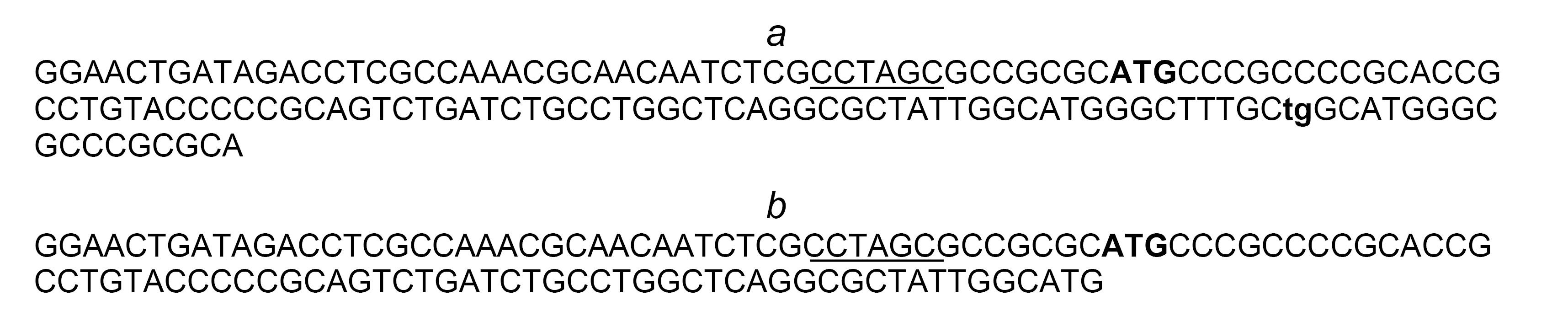 Fig. 2. Sequence fragment of the wild-type bvgAS operon of B. pertussis (a) and the Hly mutant B. pertussis No. 33 (b).