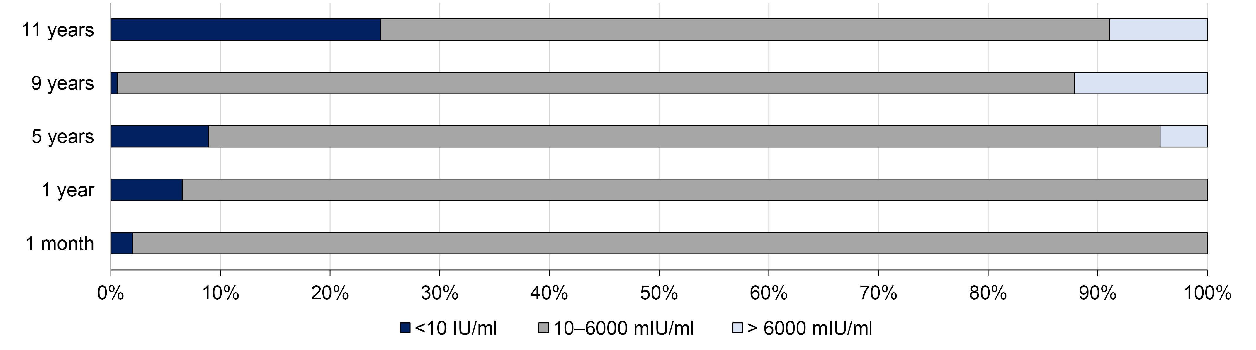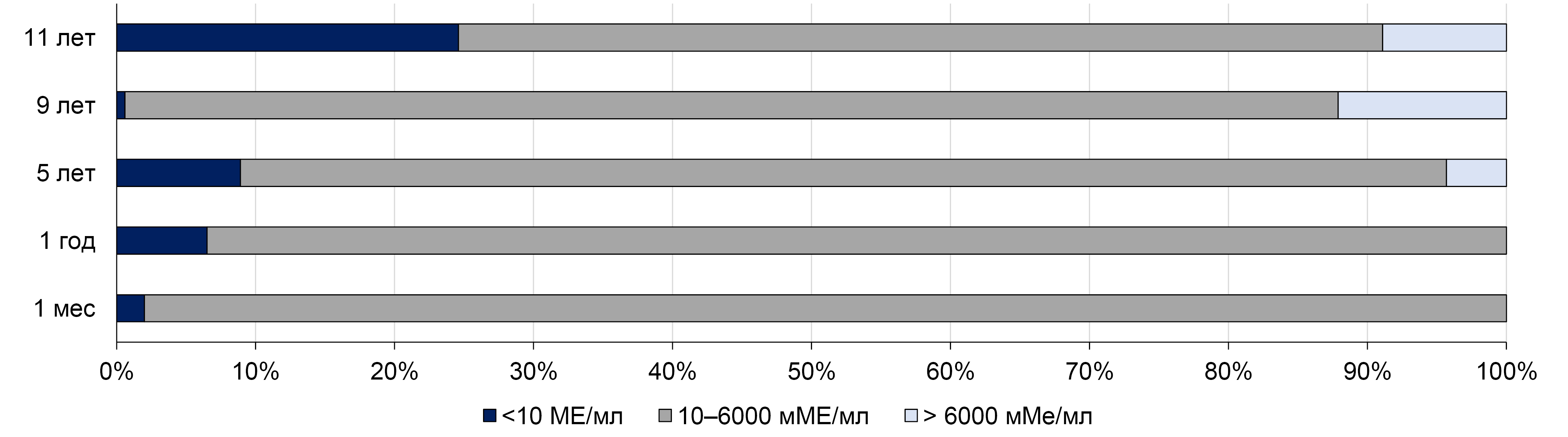 Fig. 1. The proportion of children with different concentrations of anti-HAV antibodies after a single-dose vaccination against hepatitis A in the Republic of Tuva [27].