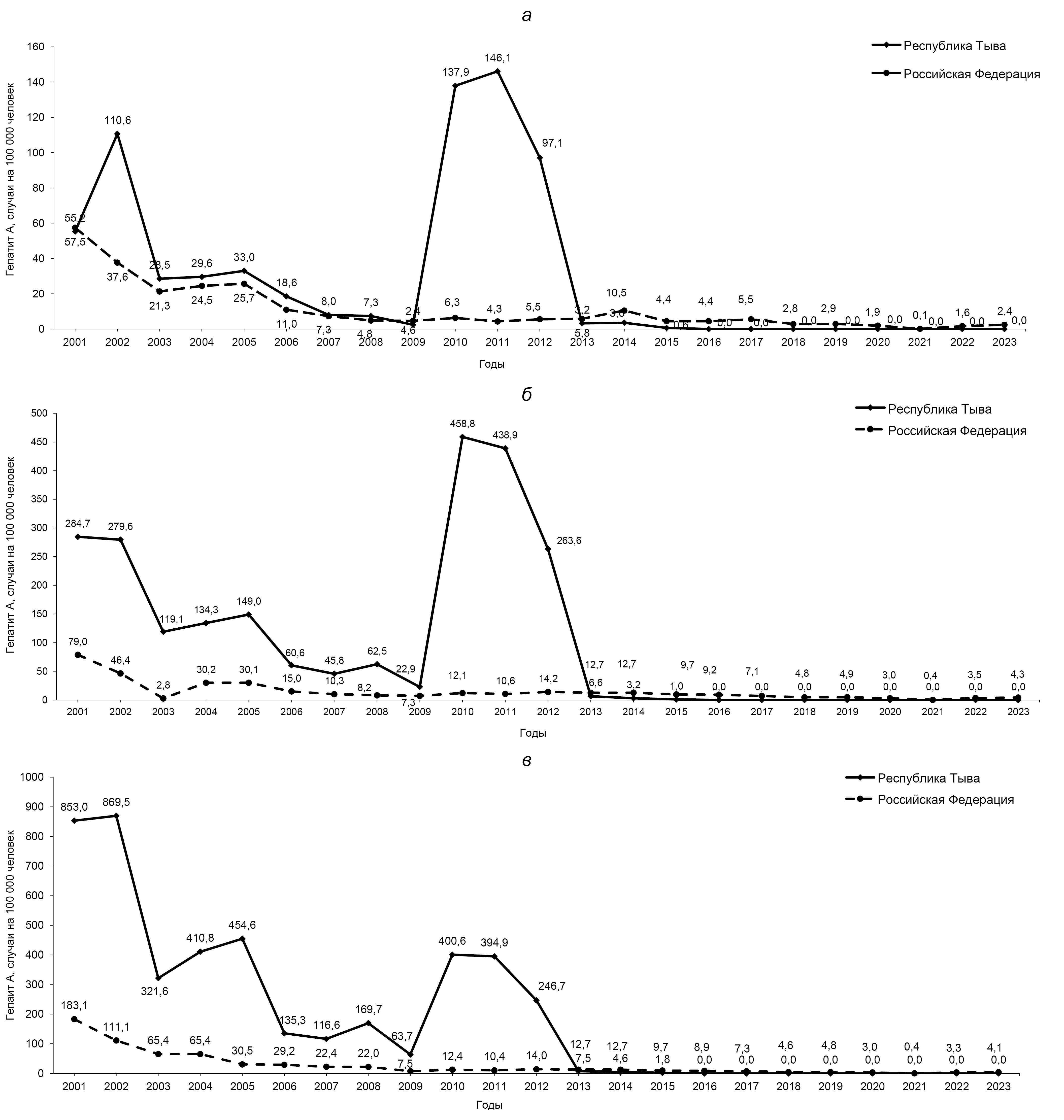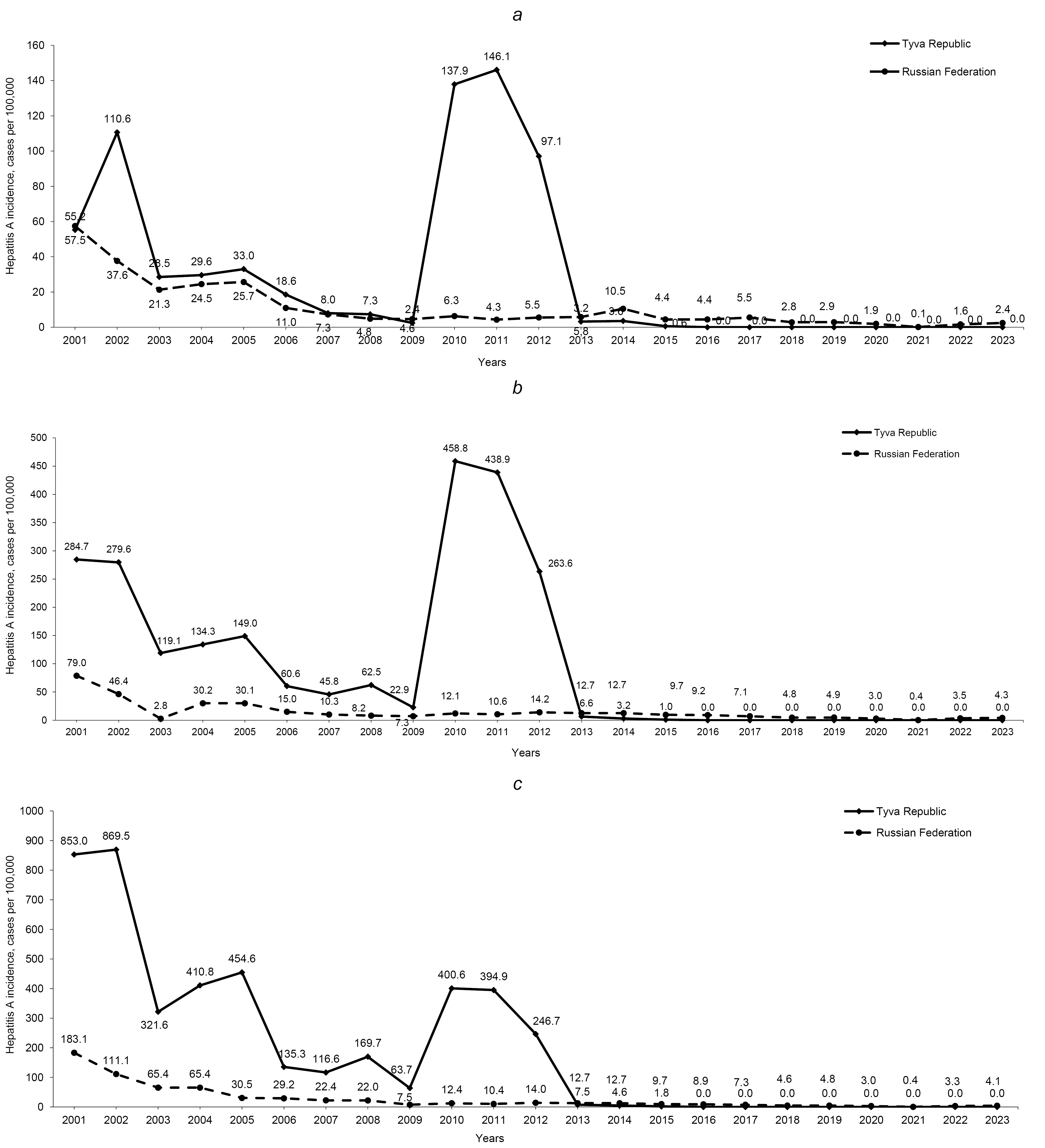 Fig. 2. The incidence of hepatitis A in the Republic of Tuva and the national average for 2001–2023 among the general population (a), children aged 0–14 (b) and 0–17 years (c) [27].