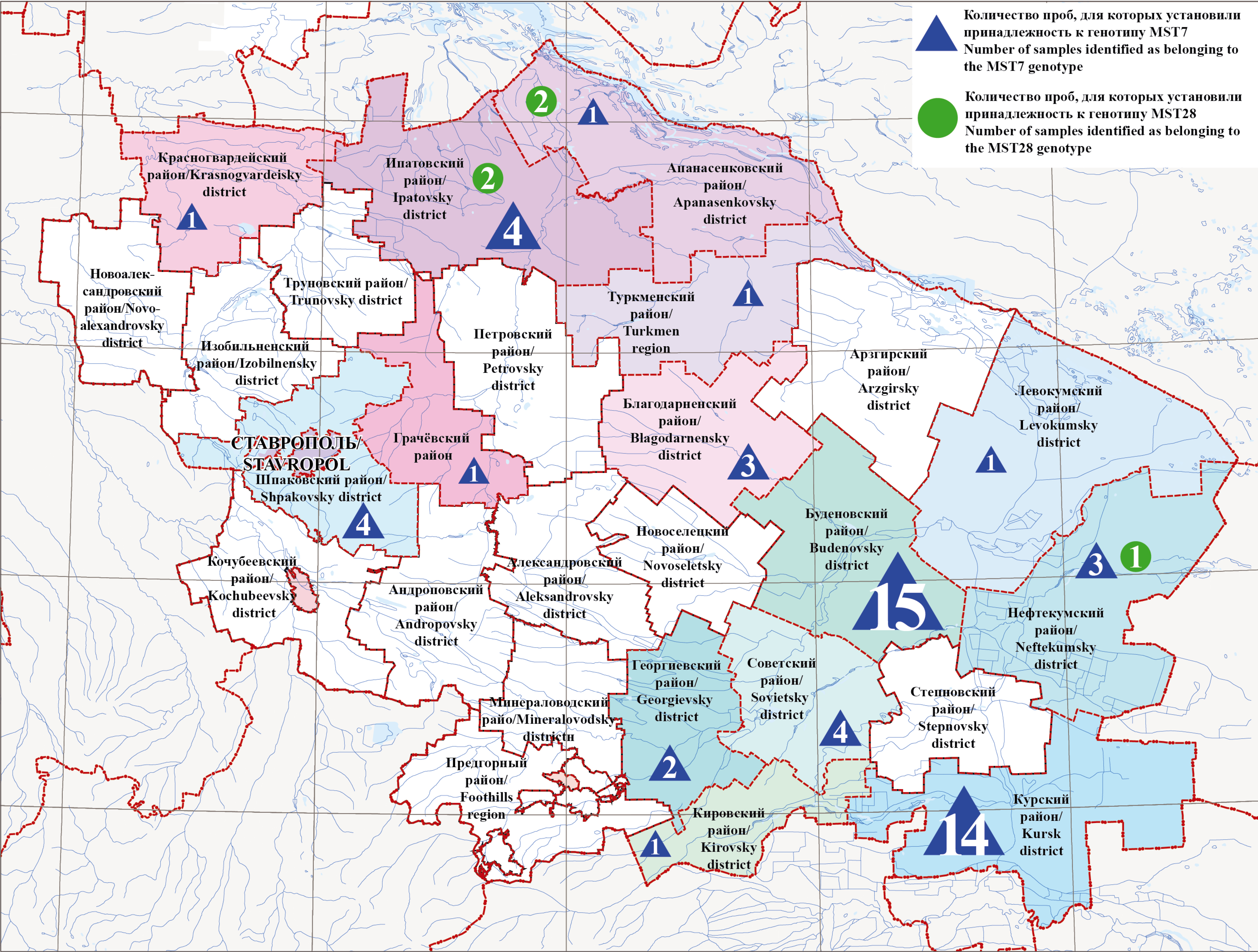 Рис. 1. Территориальное распространение MST-генотипов C. burnetii в СК (2009–2023 гг.).