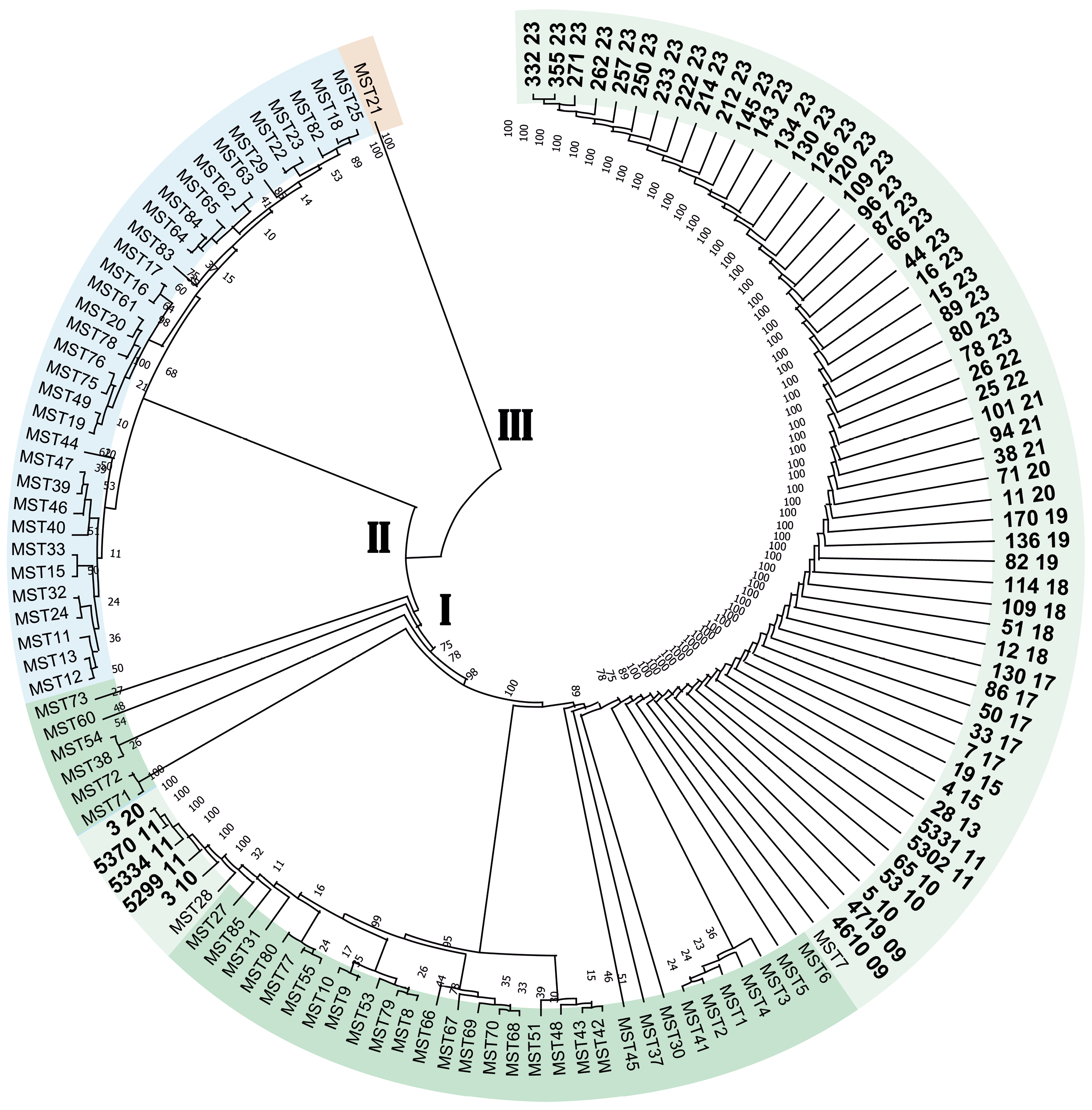 Дендрограмма построена по алгортиму UPGMA. Отмечены 3 монофилетические линии (I, II, III). Жирным шрифтом отмечены изоляты, секвенированные в Ставропольском противочумном институте Роспотребнадзора.