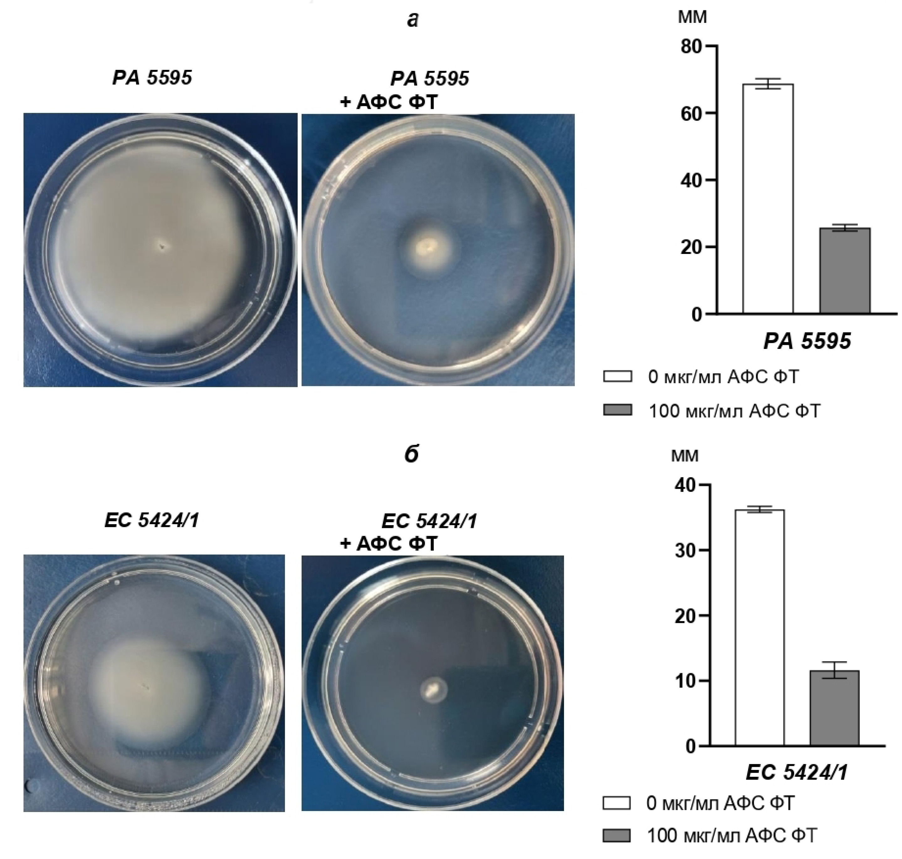 Репрезентативные изображения плавательной подвижности на чашках Петри и оценка изменения диаметра зоны подвижности P. aeruginosa 5595 (а) и E. coli 5424/1 (б) в присутствии ФТ в концентрации 100 мкг/мл. Планки погрешностей представляют собой SD 2 повторов.
