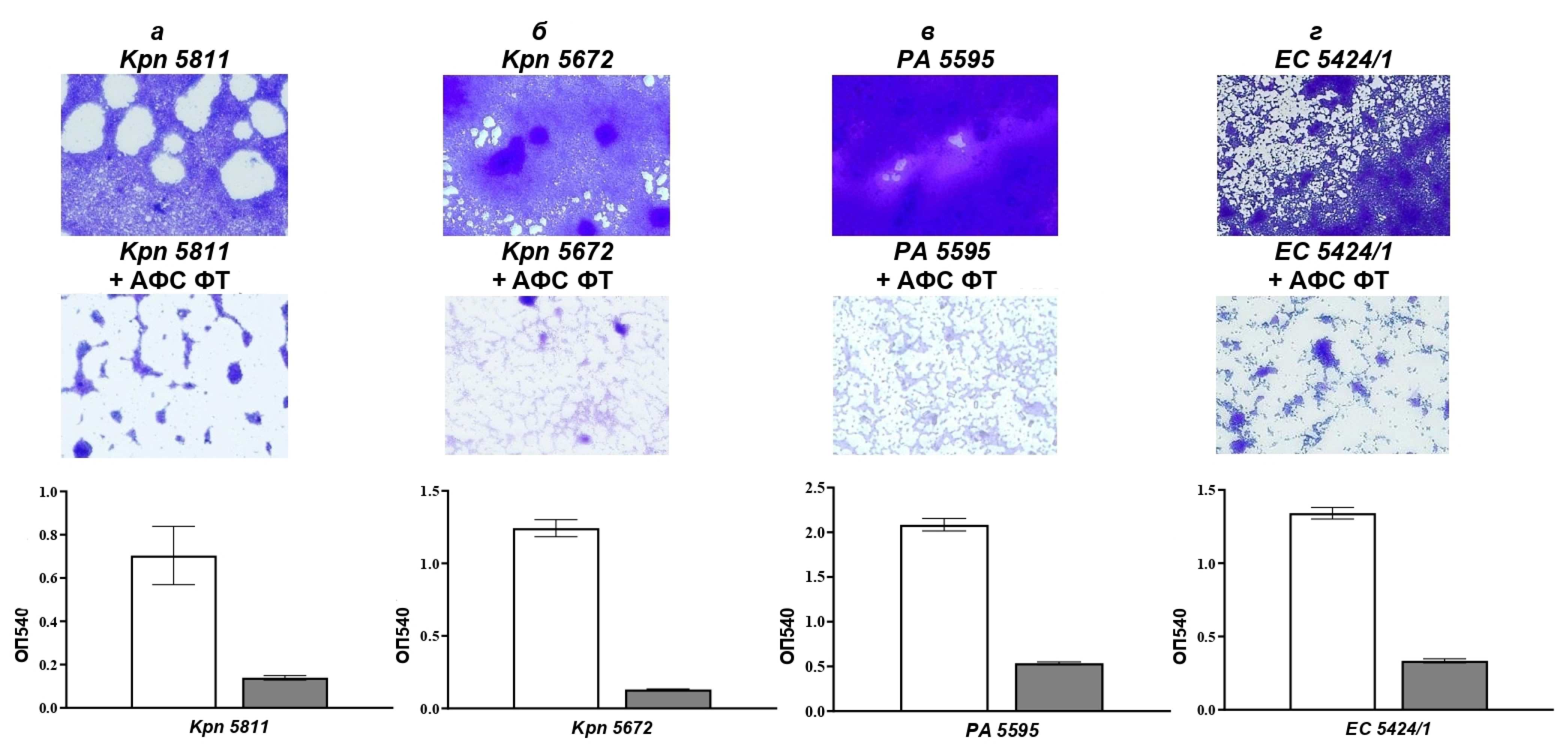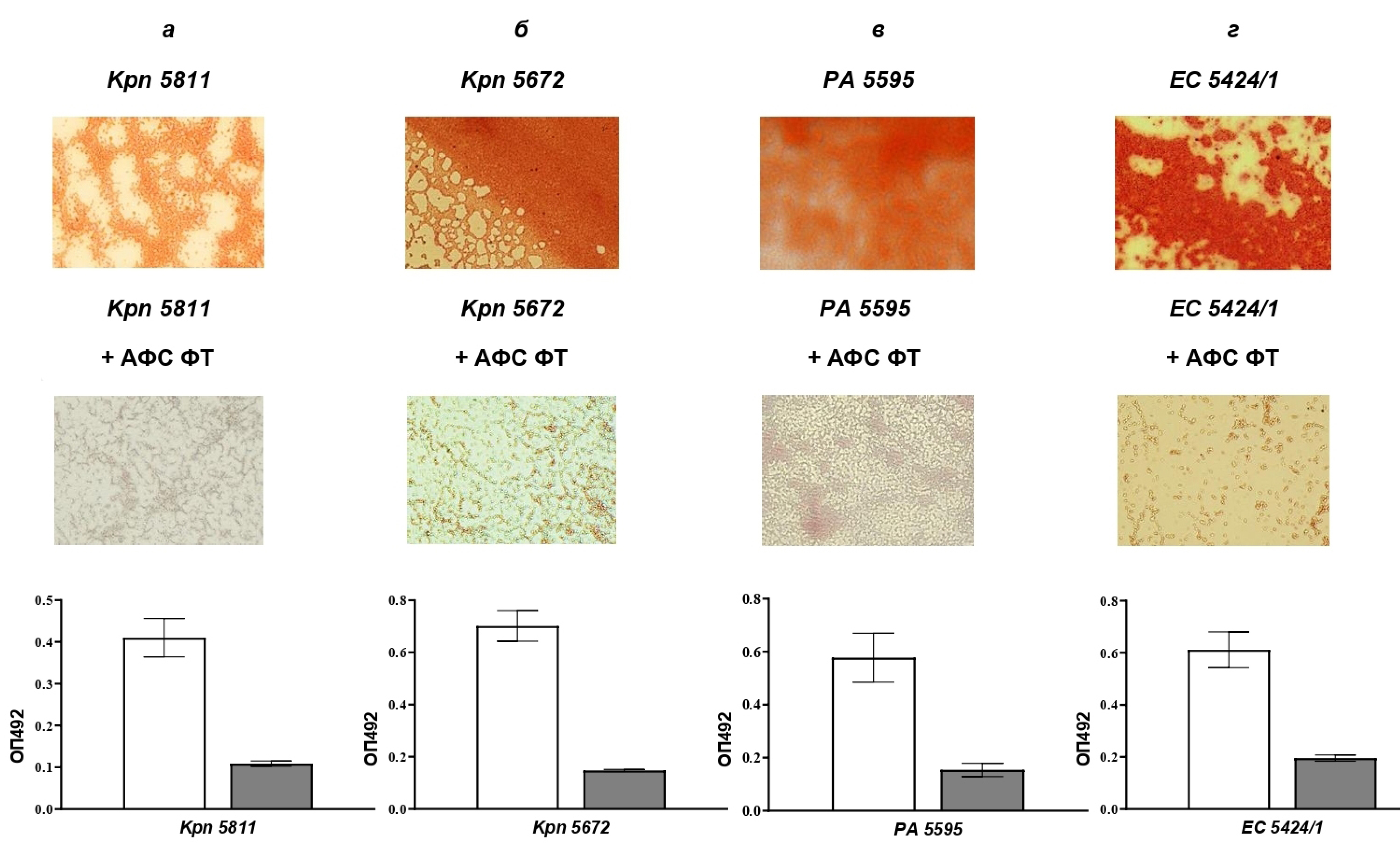 Рис. 3. ФТ ингибирует продукцию ЭПМ биоплёнки изолятов K. pneumoniae 5811 (а), K. pneumoniae 5672 (б), P. aeruginosa 5595 (в) и E. coli 5424/1 (г).