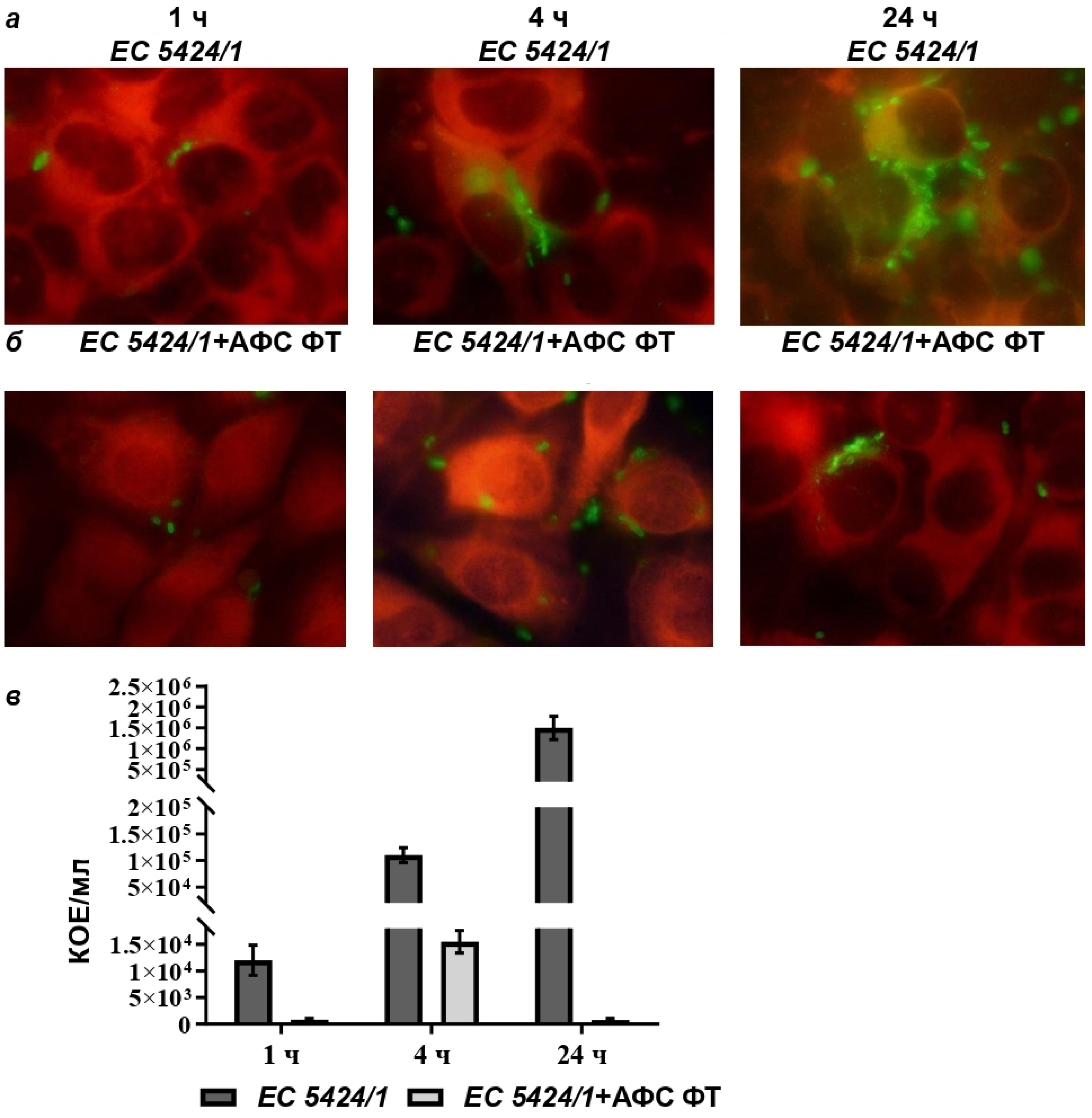 Для изолята E. coli 5424/1 при заражении использовали дозу 1,5 × 106 КОЕ/мл, что составило MOI 55. Через 1 ч инвазия составила 0,47%, а при действии ФТ — 0,053%. Через 4 ч количество внутриклеточных бактерий в контроле составило 2,1 × 105 КОЕ/мл, а в присутствии ФТ на порядок меньше — 1,1 × 104 КОЕ/мл. Через 24 ч наблюдали увеличение количества E. coli 5424/1 до 2,4 × 106 КОЕ/мл в контрольных образцах при значительном снижении размножения бактерий в присутствии ФТ до 7,5 × 102 КОЕ/мл.