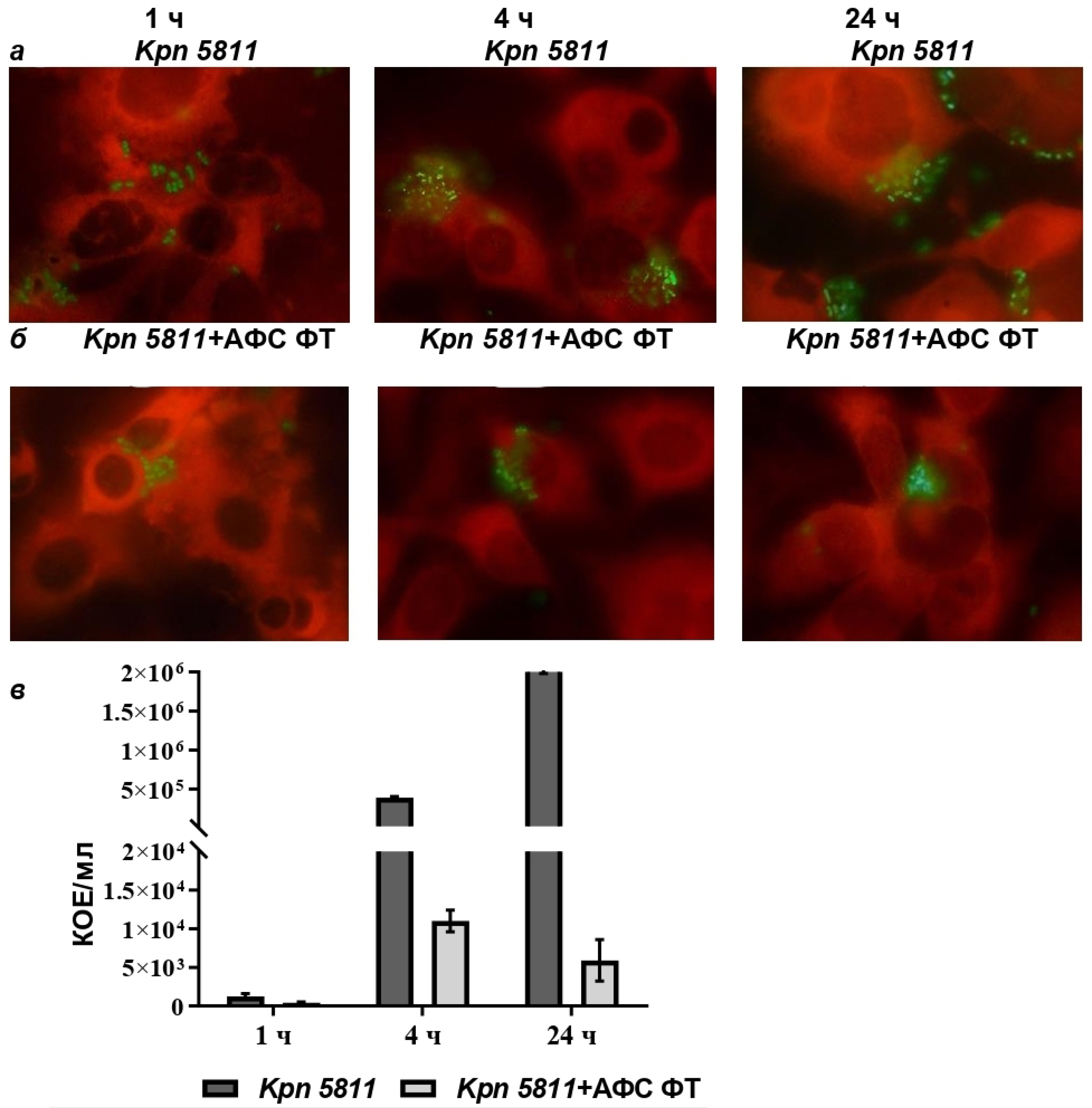 а — микрофотографии клеток PC-3, инфицированных K. pneumoniae 5811, через 1, 4 и 24 ч; б — микрофотографии клеток PC-3, инфицированных K. pneumoniae 5811, через 1, 4 и 24 ч под воздействием ФТ. Фильтр TRITC/Cy3/TagRFP/Alexa Fluor 546. в — количество внутриклеточных бактерий K. pneumoniae 5811 в клетках PC-3. Данные представлены как М ± SEM 3 независимых экспериментов (p < 0,05).