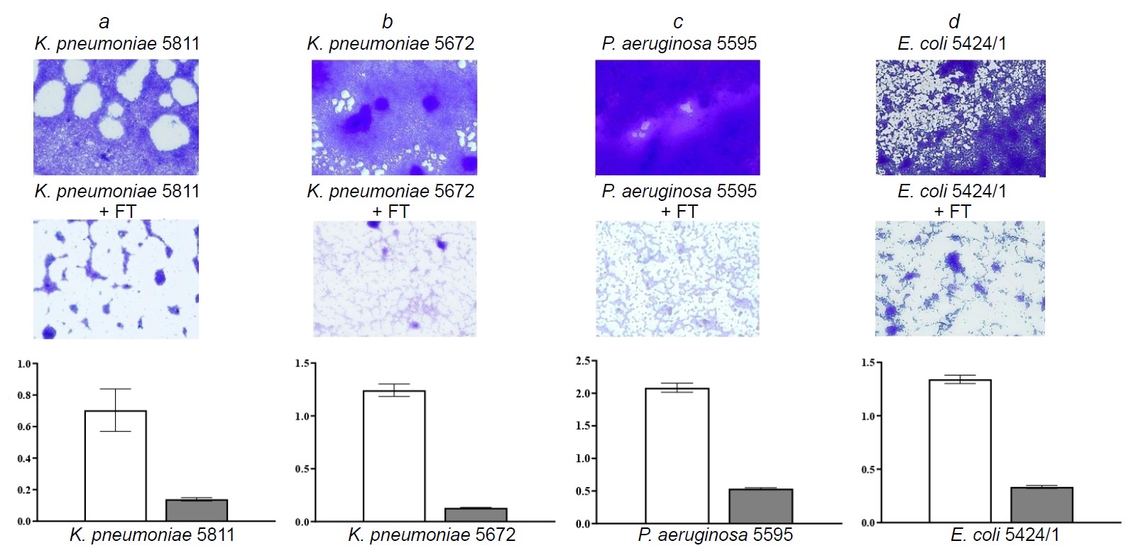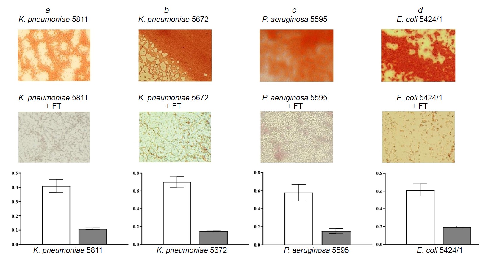 The ability of FT to suppress biofilms has been previously demonstrated for various pathogens, including carbapenem-resistant hospital-acquired infection agents. Studying the dynamics of biofilm formation in vitro and the effect of FT on this process showed that the FT blocks biofilm formation at the stage of microcolony aggregation and multilayer structure formation. Cultivation in the presence of FT has an inhibitory effect on the ability of isolates to form biofilms and, consequently, reduces the production of exopolysaccharides [26, 27]. The obtained results are of significant practical importance, as the EPM is a key factor in biofilm resistance to antibiotics and protection against the immune response.
