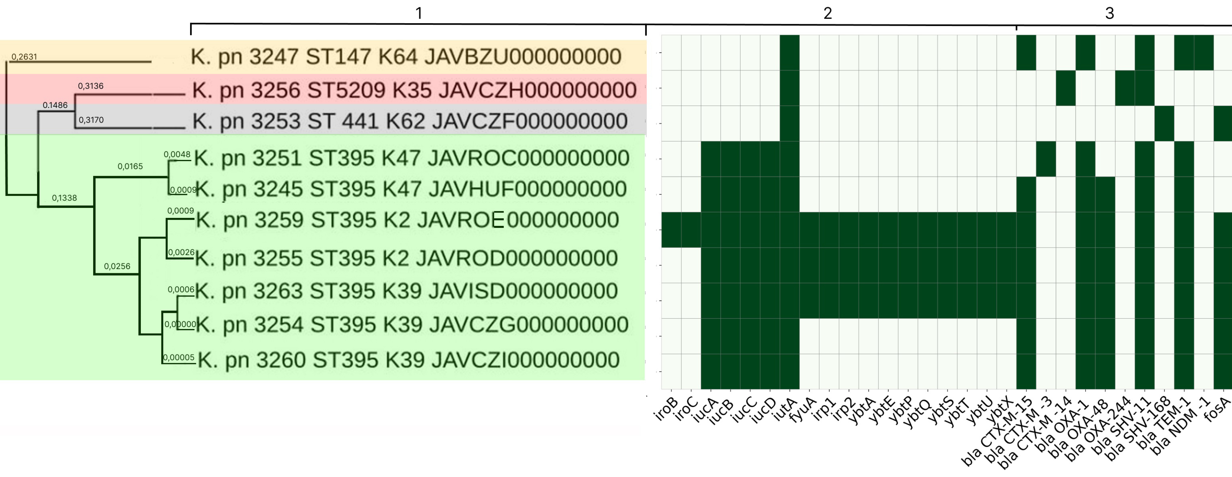 1 — вид микроорганизма, номер штамма, ST, К-тип, номер в базе данных GenBank; 2 — детерминанты генов патогенности (зелёный — наличие признака, белый — отсутствие); 3 — детерминанты АБР (зелёный — наличие признака, белый — отсутствие).