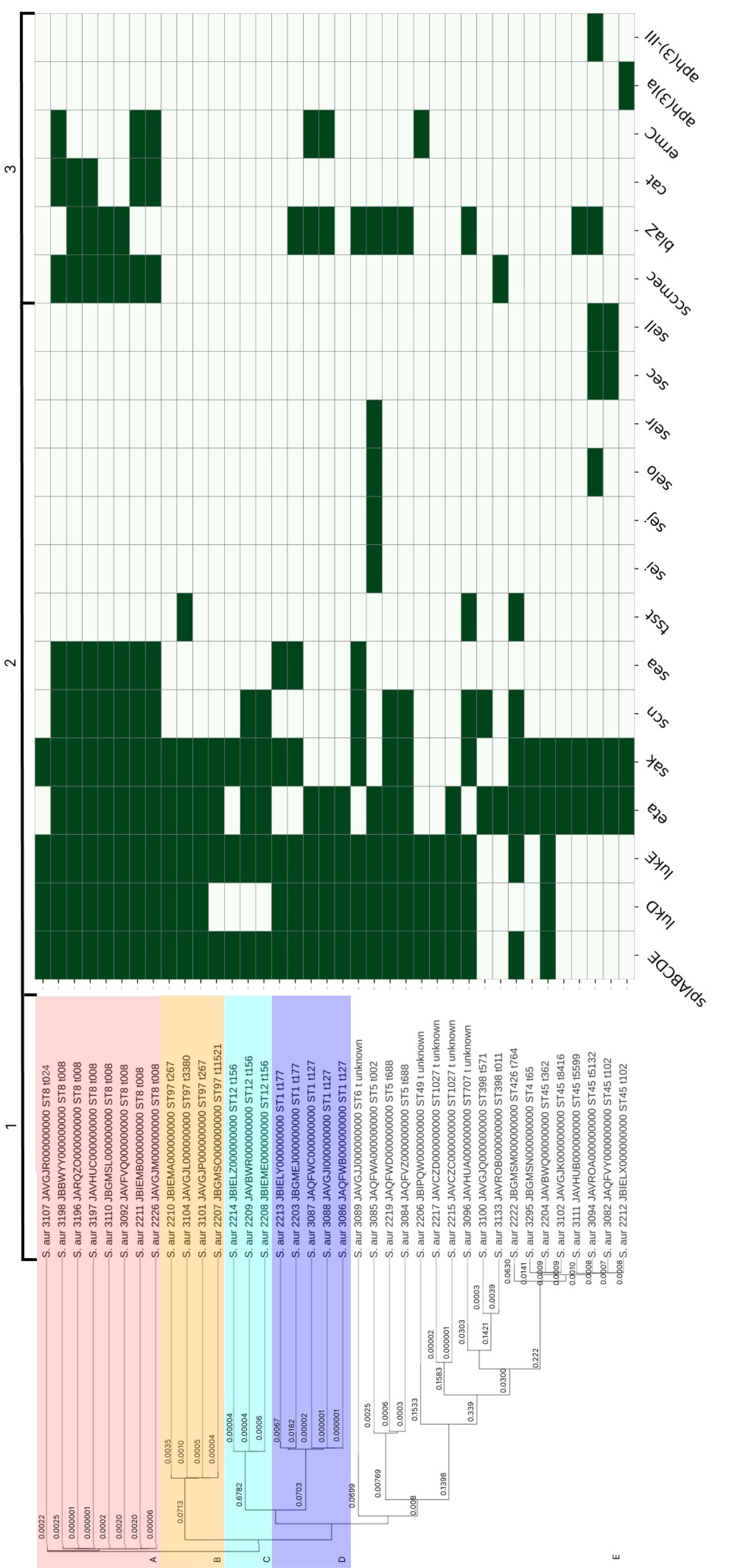Филогенетический анализ полногеномных последовательностей штаммов показал наличие пяти кластеров, объединяющих штаммы, принадлежащие к одинаковым сиквенс-типам и клональным комплексам (CC), которые представляют собой группы генетически близких сиквенс-типов. Штаммы S. aureus ST8, ST97, ST12, ST1 образовали самостоятельные группы (А, В, С, D), в состав единого крупного кластера E вошли штаммы S. aureus различных сиквенс-типов: ST6 и ST5, принадлежащие к пятому клональному комплексу (CC5), S. aureus ST4 и ST45, принадлежащие CC45, а также штаммы ST49, ST1027, ST707, ST398 и ST426, не принадлежащие к определенным клональным комплексам, но имеющие между собой филогенетическое родство (рис. 2).