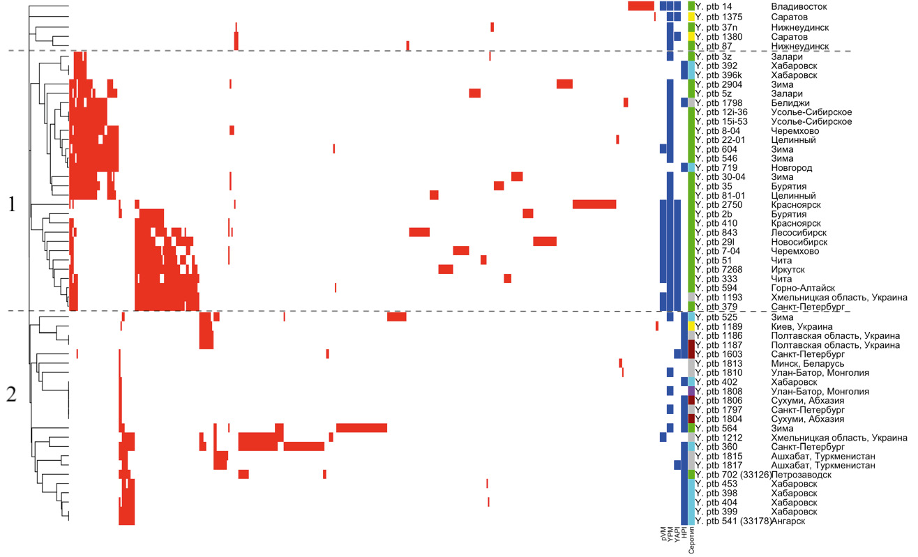Изучены 56 штаммов Y. pseudotuberculosis [11], выделенные в течение 1935–2014 гг. на территориях Восточной и Западной Сибири, Дальнего Востока, Северо-Западного и других регионов России, Монголии, Украины, Беларуси, Туркменистана и Абхазии из различных источников (cм. Приложение на сайте журнала).