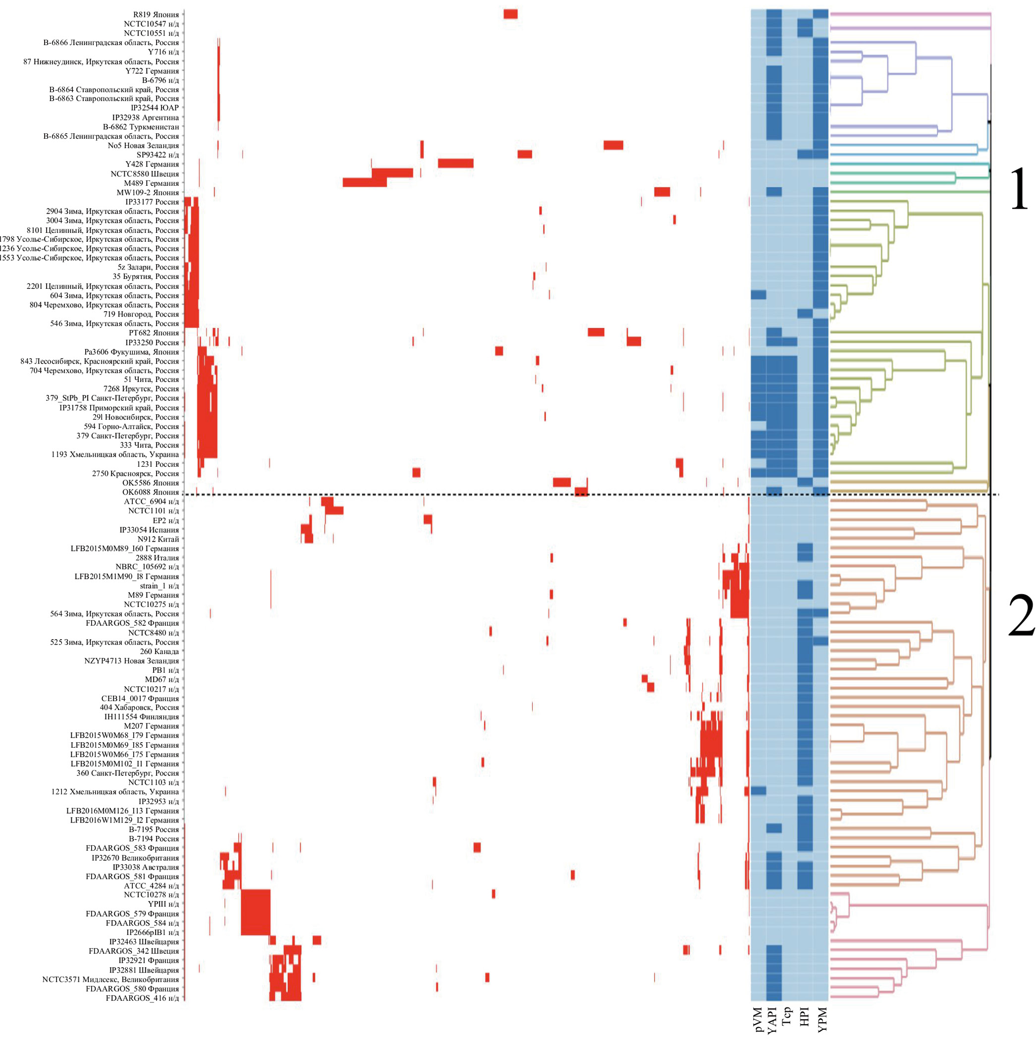 Рис. 2. Кластеризация штаммов Y. pseudotuberculosis (n = 56) по наличию спейсеров. Данные секвенирования локусов CRISPR-Cas-систем (n = 31) и сиквенсов в NCBI (n = 75). Условное обозначение по цветам: наличие спейсера — красный, наличие фактора патогенности — синий. / Fig. 2. Clusterization of Y. pseudotuberculosis strains (n = 56) by presence of spacer. CRISPR-Cas system sequenced data (n = 31) and NCBI data (n = 75). Color designations: presence of spacer — red, presence of factor — blue.