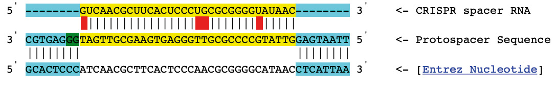 Fig. 3. Protospacer sequence of plasmid pVM82 kDa (153 kb) of Y. pseudotuberculosis IP31758 to spacer 114 of locus YP3.