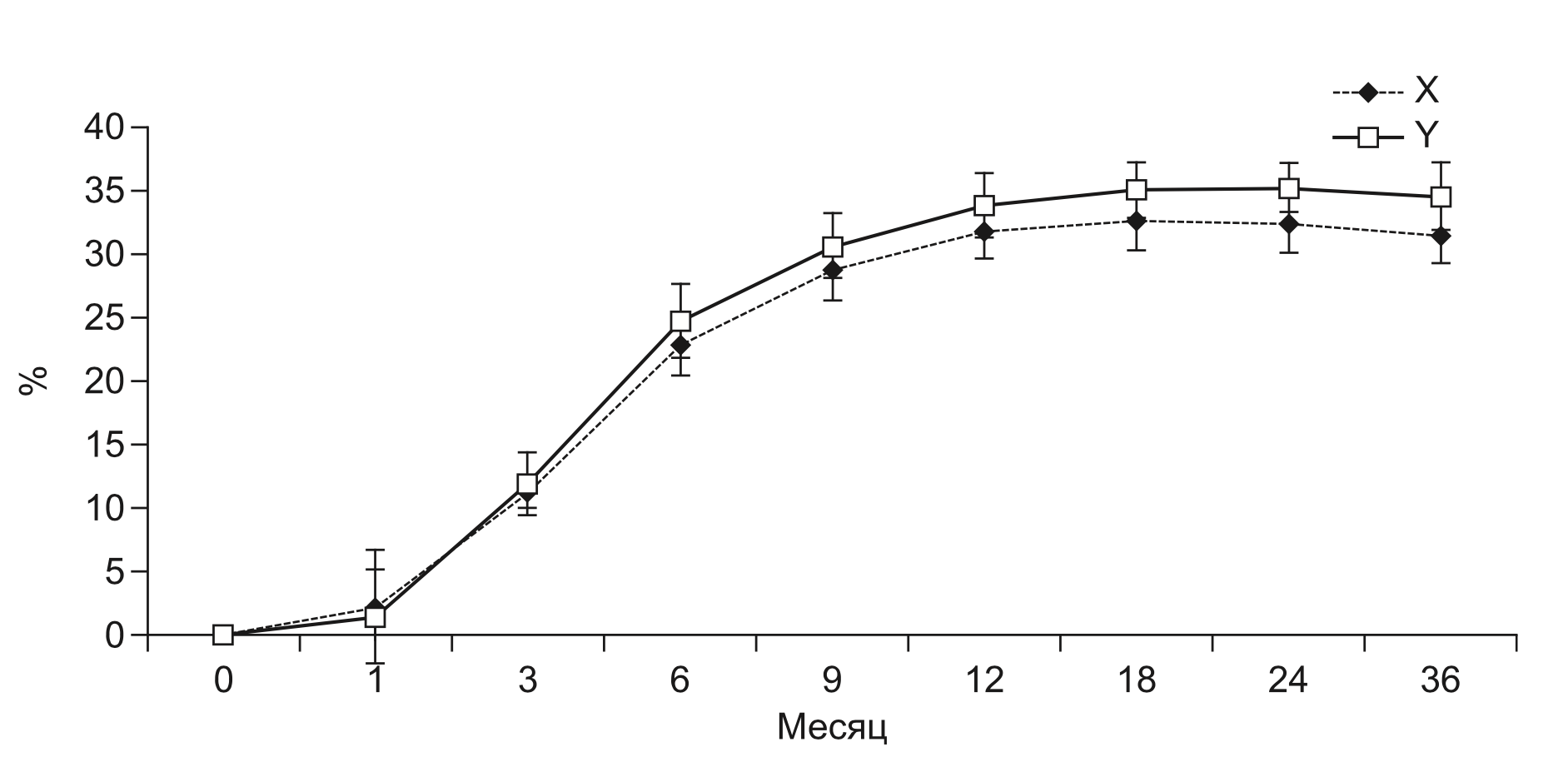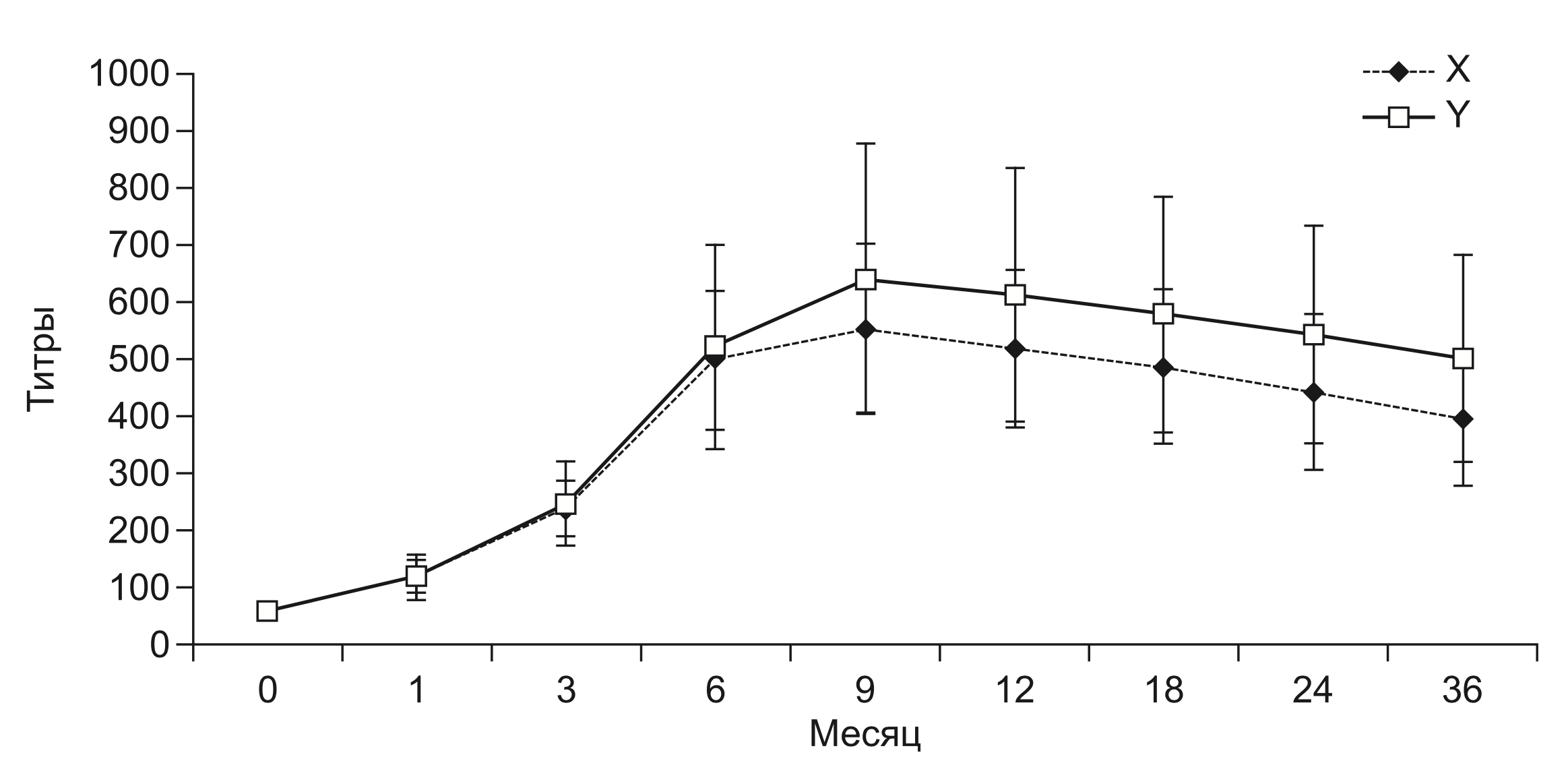 Рис. 1. Динамика специфических АТ в сыворотке крови вакцинированных добровольцев после однократной иммунизации паротитной вакциной сериями с разной специфической активностью ВП в прививочной дозе. 0 месяц — до вакцинации; «Х» — группа добровольцев, привитых серией вакцины со специфической активностью ВП 4,82 lg ТЦД50 в одной прививочной дозе; «Y» — группа добровольцев, привитых серией вакцины со специфической активностью ВП 5,23 lg ТЦД50 в одной прививочной дозе (здесь и на рис. 2, 3). Значения титров АТ в ИФА представлены, как GM±SD.