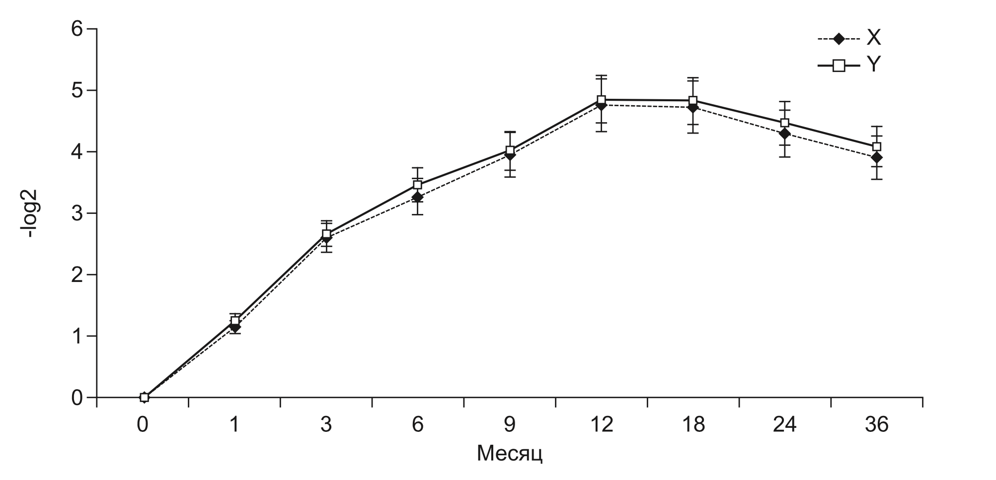 При сравнении титров специфических АТ между двумя группами привитых добровольцев статистическая разница не была выявлена на всем периоде наблюдения, U-test p> 0,05. Максимальный уровень специфических АТ наблюдался на 9 месяце после вакцинации. Затем на 36 месяце после вакцинации в крови добровольцев обеих групп отмечалось достоверное падение титра специфических АТ (t-test p< 0,004), хотя сами титры при этом оставались положительными (≥1:100). Максимальные средние значения ИА в обеих группах добровольцев наблюдались на 18 месяце и составляли в обеих группах (М) >32%, что свидетельствует о формировании зрелого специфического иммунитета. Достоверной разницы между группами по ИА не было выявлено, U-test p>0,05. Следует отметить, что после достижения максимальных значений ИА в обеих группах достоверного падения показателя не наблюдалось до конца наблюдения, t-test p>0,05. Ни в одной из групп не было выявлено корреляции между титром АТ и уровнем ИА. Через 3 месяца после иммунизации у всех участников отмечена сероконверсия в РН с вакцинным штаммом ВП «Л-3». Динамика НТ к штамму ВП «Л-3» была схожа в обеих группах добровольцев вне зависимости от титра ВП в прививочной дозе (рис.3). При сравнении НТ к штамму ВП «Л-3» в сыворотке крови привитых между группами достоверной разницы не выявлено ни на одной точке исследования (U-test p > 0,05). С 6 месяца после вакцинации и до конца строка наблюдения в сыворотке крови всех привитых добровольцев в обеих группах титры в РН к вакцинному штамму ВП «Л-3» были ≥ 3-log2. Максимальные титры нейтрализующих антител наблюдались на 12 месяце и сохранялись на 18 месяце (4,76±0,61-log2 и 4,86±0,66 -log2) в группе добровольцев «X» и «Y» соответственно. Затем к 36 месяцу отмечалось достоверное падение НТ к штамму ВП «Л-3» в обеих группах (t-test p<0,05). С 6 месяца после вакцинации привитые в обеих группах обладали НТ в полном спектре, т.е. ко всем 5 гетерологичным штаммам ВП, использованным в нашем исследовании. Максимальные НТ к гетерологичным штаммам ВП наблюдались через 12 месяцев и сохранялись через 18 месяцев в обеих группах, и составляли >2 -log2, min 2,42±0,5 -log2, max 3,07±0,63-log2 (табл.).. При сравнении НТ к соответствующим гетерологичным штаммам ВП между двумя группами привитых добровольцев достоверная разница не выявлена (U-test p>0,4). Ожидаемо НТ к данным штаммамВП в обеих группах добровольцев были достоверно ниже, чем НТ к вакцинному штамму ВП «Л-3» (U-test р<0,005) в течение всего периода наблюдения (табл.). При сравнении НТ к разным штаммам ВП минимальная разница у добровольцев обеих групп наблюдалась между НТ к вакцинному штамму ВП «Л-3» и НТ к штаммам ВП генотипов «А», «В» и «D» (1,3-1,4 раза, t-test p<0,05), а максимальная разница наблюдалась между НТ к вакцинному штамму ВП «Л-3» и НТ к штаммам ВП генотипов «С» и «H» (1,6-1,9 раза, t-test p<0,005). У всех привитых добровольцев на протяжении всего периода наблюдения не выявлена корреляция между титрами специфических АТ и НТ к штамму «Л-3» (r= -0,23-0,031), также как и между титром специфических АТ в ИФА и титрами в РН со всеми 5 штаммами ВП была крайне слабой. Отмечена положительная корреляция между НТ к штамму «Л-3» и НТ к 5 гетерологичным штаммам ВП (r=0.63-0.79) у добровольцев обеих групп на протяжении периода c 12 по 24 месяц после вакцинации. Однако на 36 месяце наблюдения корреляция между НТ к штамму «Л-3» и НТ к ВП генотипов «C» и «H» достоверно упала до r=0.42-0.46 (p<0.05). В целом, соответств