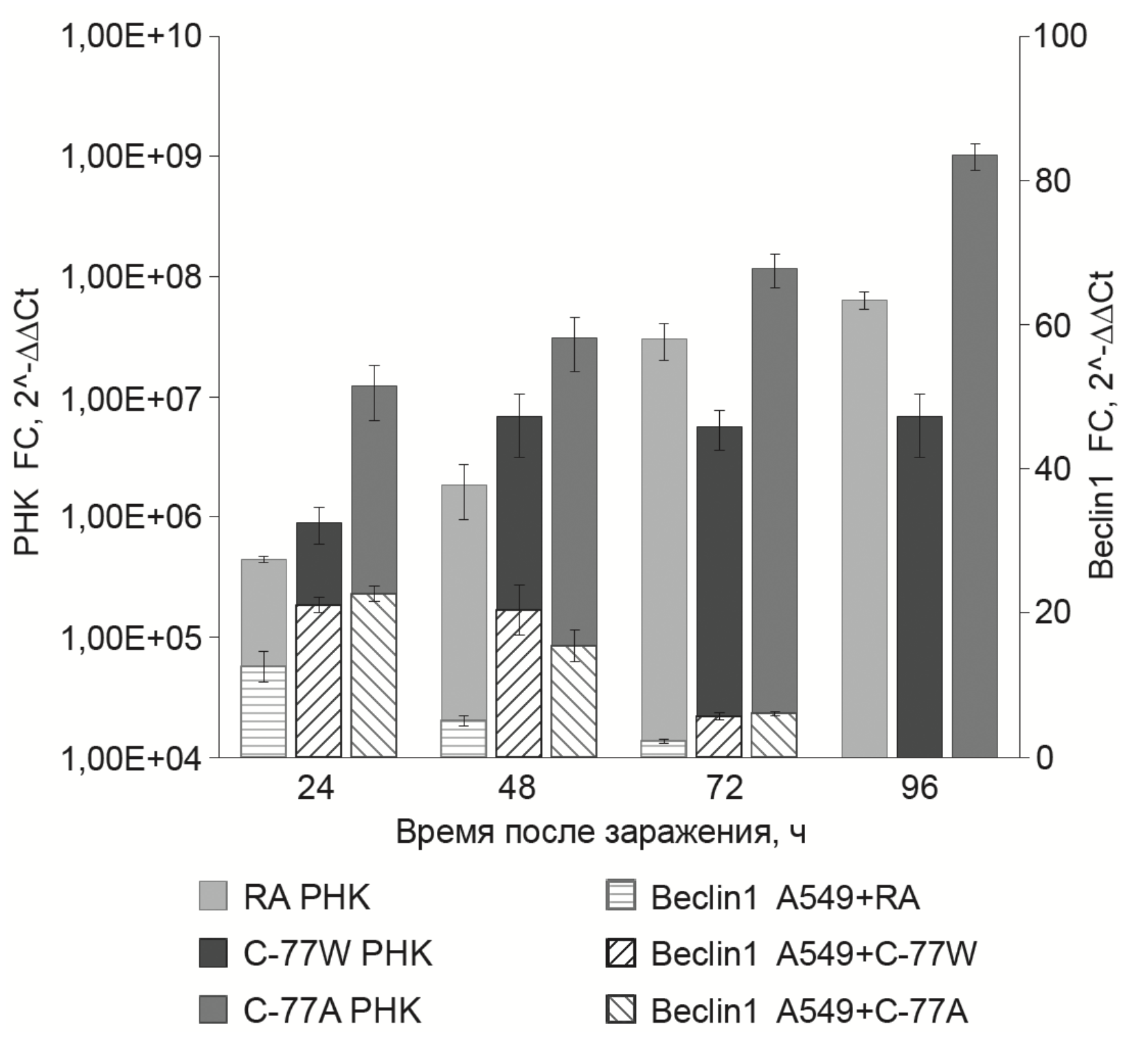 Рис. 1. Накопление РНК вируса краснухи (левая шка- ла) штамма Wistar RA27/3 (RA) и штамма С-77 дикого (С-77W) и аттенуированного вариантов (С-77А), а также экспрессия мРНК белка Beclin1 (правая шкала) в культуре клеток А549 через 24-96 ч после ее заражения вирусом краснухи штаммами — Wistar RA27/3 или С-77 дикого и аттенуированного варианта. Здесь и на рис. 2 результаты представляют кратность изменения (FC) между нормализованными значениями пороговых циклов (ΔCt) зараженной культуры клеток непосредственно перед заражением (0 ч) (ΔΔСt) для каждой временной точки.