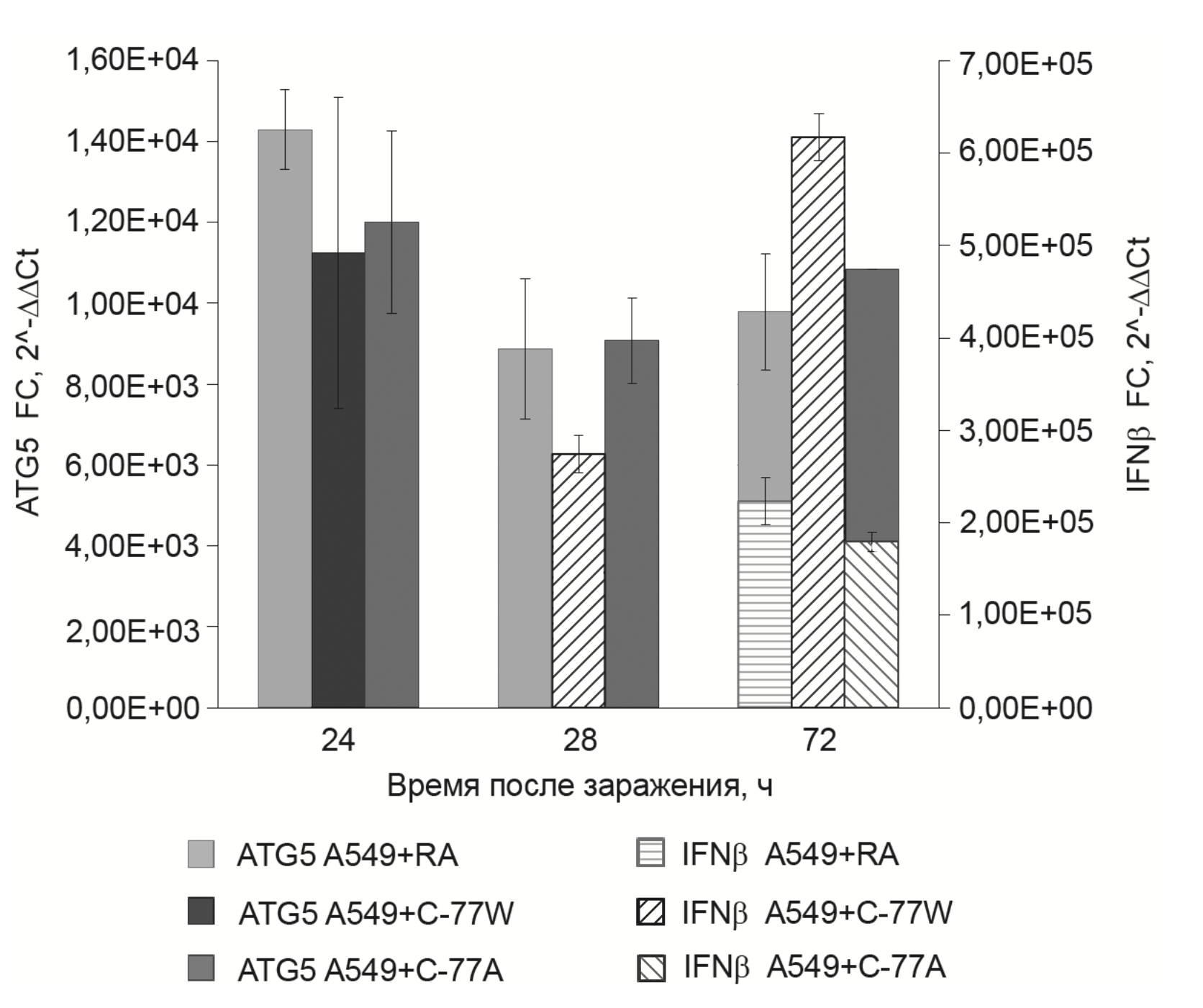 Рис. 2. Экспрессия мРНК белков ATG5 (левая шкала) и IFNβ (правая шкала) через 24-72 ч после заражения культуры клеток А549 вирусом краснухи штаммами Wistar RA27/3 (RA) или C-77 дикого (С-77W) и аттенуированного варианта (С-77А).