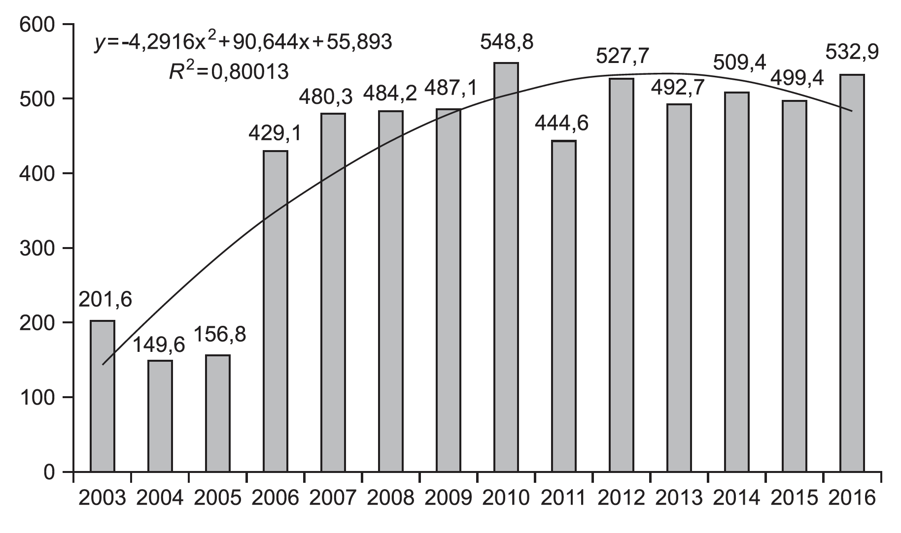 Рис. 1. Динамика уровня заболеваемости ОКИ у населения Оренбургской области в 2003-2016 гг. (на 100 тыс. населения).