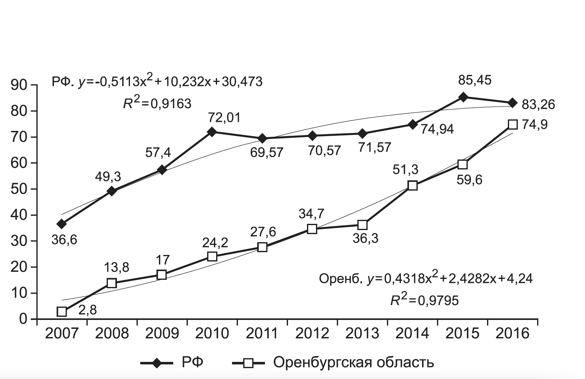 Рис. 2. Динамика уровня заболеваемости РВИ у населе- ния Оренбургской области в 2007-2016 гг. в сравнении с показателями заболеваемости по РФ (на 100 тыс. населения).