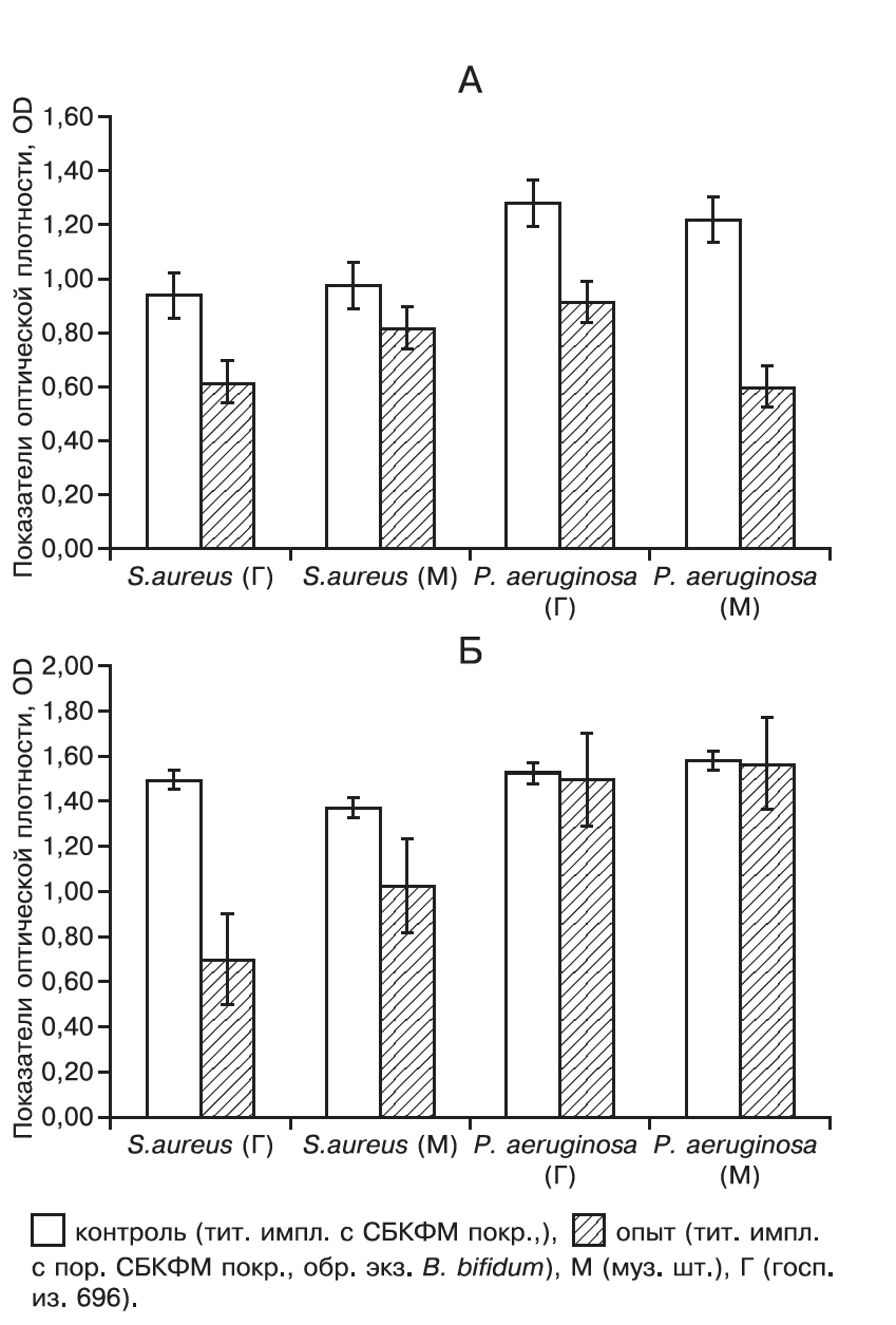 Aim. To study the effect of exometabolites of Bifidobacterium bifidum on the biological properties of causative agents of purulent-septic complications in trauma and orthopedic practice and to evaluate their effect on reparative bone tissue regeneration in the peri-implant zone in the postoperative period. Materials and methods. Using the museum cultures of B. bifidum 791, S. aureus 25923 ATCC, P. aeruginosa 27853 ATCC and antibiotic-resistant hospital strains, isolated from patients with periprosthetic infection and osteomyelitis (S.aureus 889, S. epidermidis 2041, P. aeruginosa 9672). The supernatant (exometabolites) of B. bifidum 791 was obtained from a broth culture, which was centrifuged and passed through a membrane filter. In studying the effect of exometabolites of bifidobacteria on the proliferative activity of bacteria, the two-day supernatant of B. bifidum was co-incubated for 24 cultures of museum and hospital strains. The biofilm formation in vitro experiment was studied after 24 and 96 hours. Treatment of implants with exometabolites of bifidobacteria was carried out for 30 minutes. Experimental research was carried out on rabbits of breed «Flandr». Titanium implants without coating (control) and with porous SBKFM coating treated with exometabolites of B. bifidum (experiment) were screwed into the tibial bones of animals. Histological examination and computed microtomography were performed using a SkyScan 1172 instrument (BRUKER). Result. Depending on the time of cultivation of bifidobacteria, the supernatant B. bifidum 791 had a bacteriostatic and bactericidal effect to varying degrees, and also inhibited the biofilm formation of the studied microorganism cultures, including antibiotic-resistant strains. In in vivo experiments, the use of porous SBKFM coatings on titanium implants treated with the supernatant of bifidobacteria made it possible to maintain the mineral density indices of the peri-implantation zone at a high level in comparison with the use of control titanium implants without coating. Conclusion. Positive results of preclinical experiments are promising for further clinical research in trauma and orthopedic practice, which ultimately will reduce the risk of developing septic complications and prevent the migration of metal structures and instability of endoprostheses in the postoperative period.