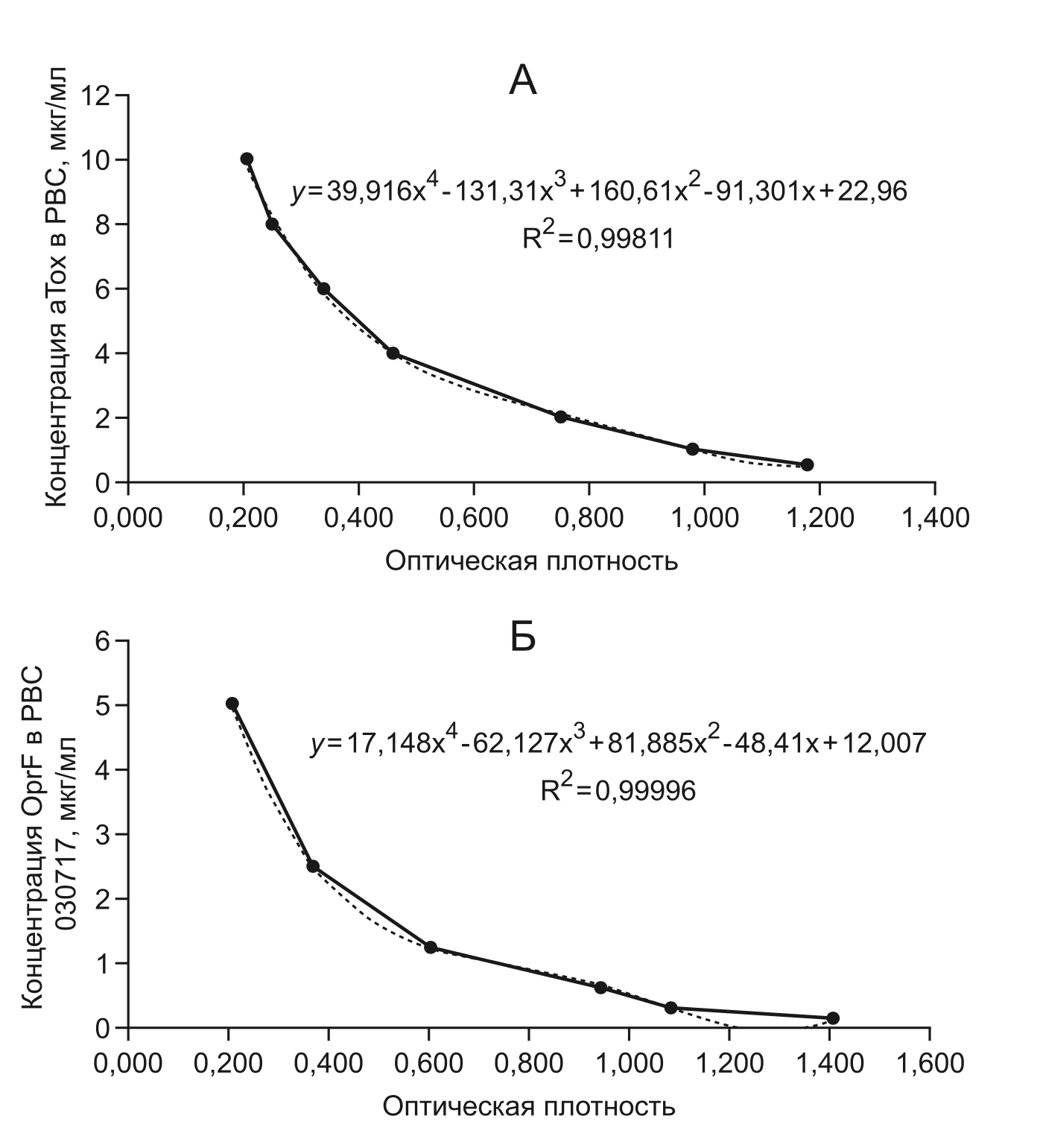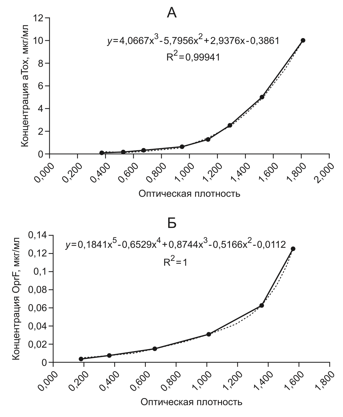 Рис. 1. Калибровочные графики зависимости оптической плотности от концентрации aTox (А) и OprF (Б) (мкг/мл).