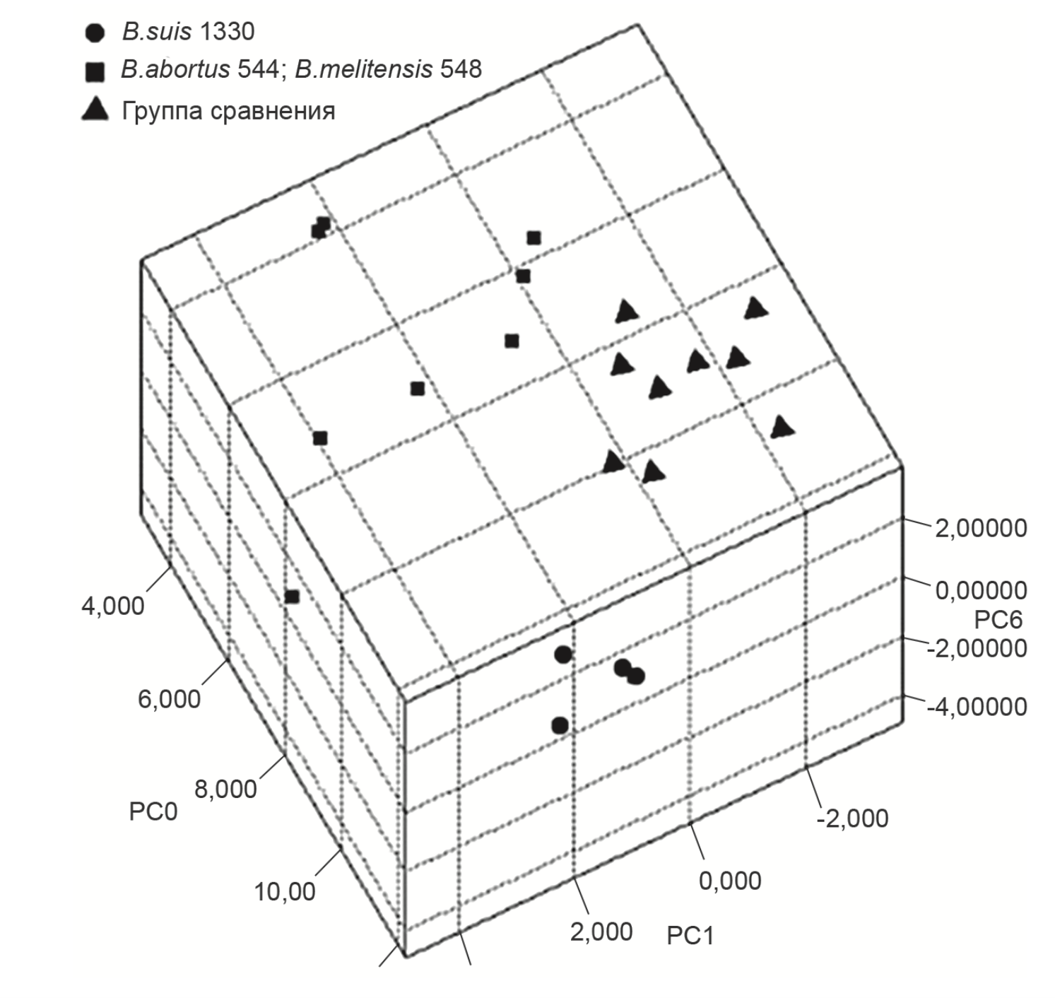 Рис. 1. Диаграмма распределения масс-спектров экстрактов лейкоцитов крови мышей, зараженных культурами B. abortus 544, B. melitensis 548 и B. suis 1330, а также из группы сравнения на основании результатов анализа MS профилей методом PCA