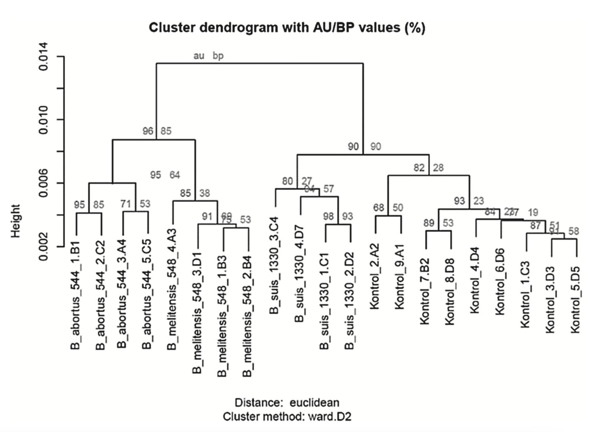 На диаграмме можно отме- тить четкое разделение белковых профилей экстрактов крови мы- шей при остром бруцеллезе на две группы: первую образуют жи- вотные, зараженные культурами B. abortus 544 и B. melitensis 548, во вторую вошли животные, инфицированные B. suis 1330. Распределение образцов на ос- новании MS данных полностью совпадает с видовой принадлеж- ностью используемых при зара- жении штаммов бруцелл. Формирование отдельного кластера образцами лейкоцитарной фракции крови животных, зараженных B. abortus 544 и B. melitensis 548, на дендрограмме (рис. 2) в полной мере согласуется с общеизвестными данными о генетической близости представителей указанных двух видов бруцелл и с результатами на основании ана- лиза сходства белковых профилей их культур.