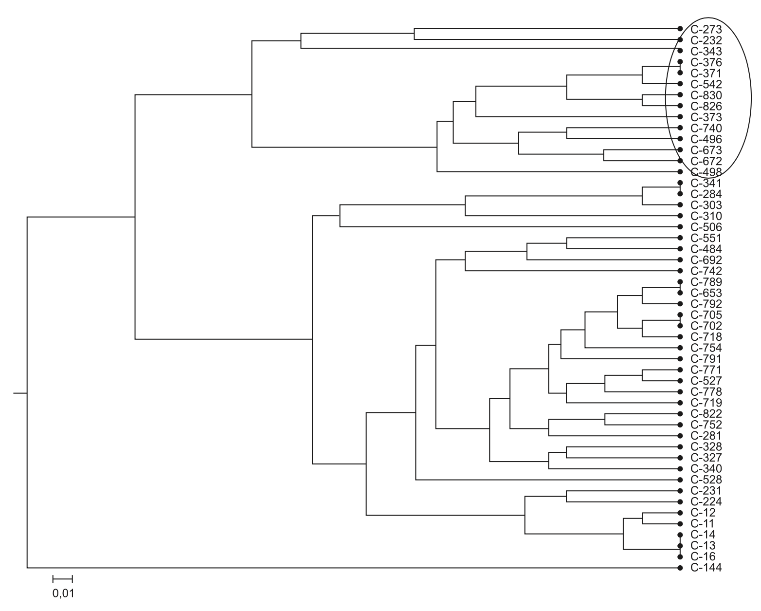 Филогенетические взаимоотношения штаммов Y. pestis, дендрограмма построна с использованием алгоритма UPGMA.