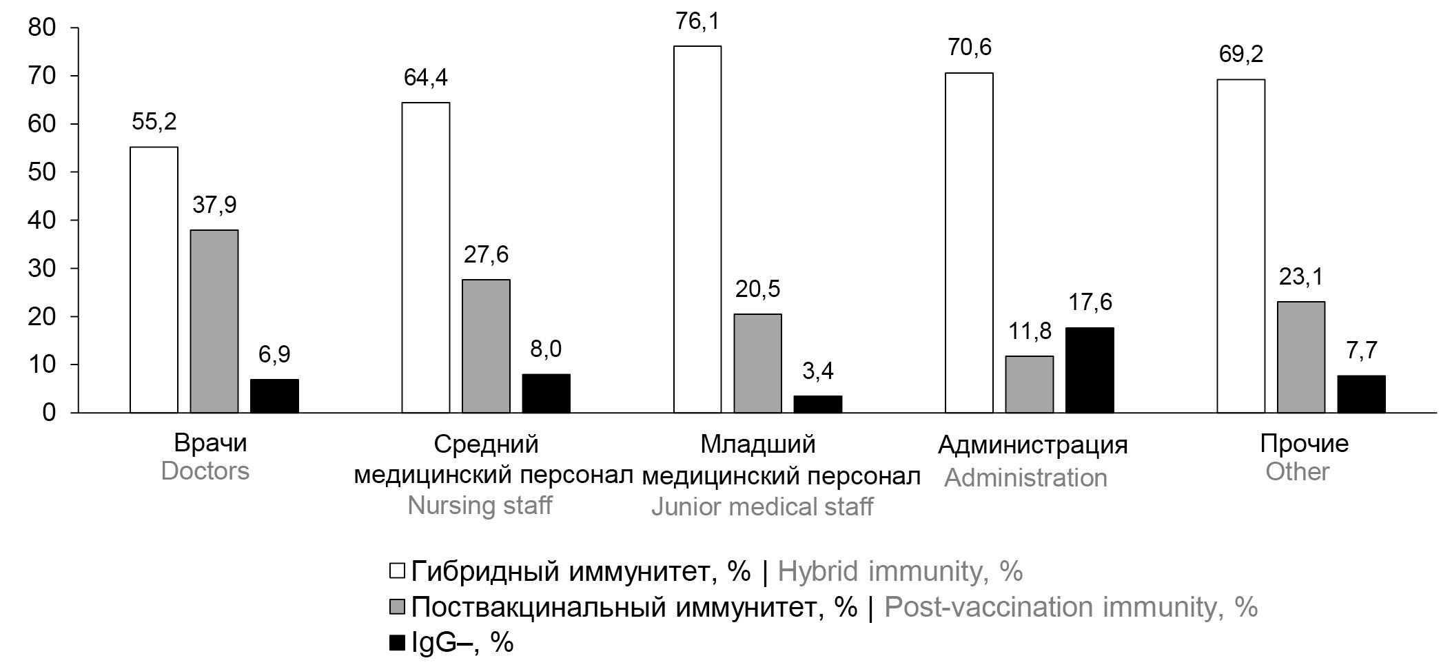 Больше всего нами было выявлено сотрудников с гибридным иммунитетом в категории младшего медицинского персонала, что, возможно, связано с более близкими и более длительными контактами при уходе за пациентами и неполным соблюдением ими санитарно-противоэпидемического режима. Среди врачебного персонала гораздо ниже, чем среди других категорий персонала, удельный вес лиц с гибридным иммунитетом и выше удельный вес лиц, привитых против SARS-CoV-2, что указывает на значительно меньшие контакты с пациентами, более высокие ответственность, грамотность и настороженность лиц этой категории.