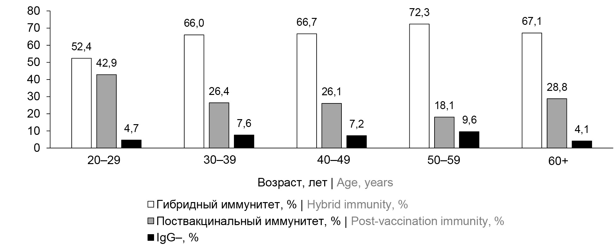 Мы также выявили, что в старших возрастных категориях (50–59 и 60+ лет) удельный вес лиц с гибридным иммунитетом (IgG к RBD Spike SARS-CoV-2 и IgG к NC-белку) превалировал и составлял 72,3 и 67,1% соответственно, что совпадает с данными официальной статистики по заболеваемости COVID-19. По итогам 2021 г. в возрастных группах старше 50 лет удельный вес заболевших составил 44% [10]. С поствакцинальным иммунитетом более высокий удельный вес лиц с наличием IgG-антител к RBD Spike SARS-CoV-2 был отмечен среди лиц 20–29 лет (42,9%). По зарубежным данным, в США более высокая распространённость IgG-антител среди медицинских работников отмечена у лиц младше 40 лет, в Европе и Восточной Азии — среди медицинских работников старшего возраста, у лиц в возрасте 18–29 лет выявлен максимальный показатель серопозитивных результатов (21,0%), в группе 60–69 лет — 18,2%, 35–54 лет — 54,5% [11–13].