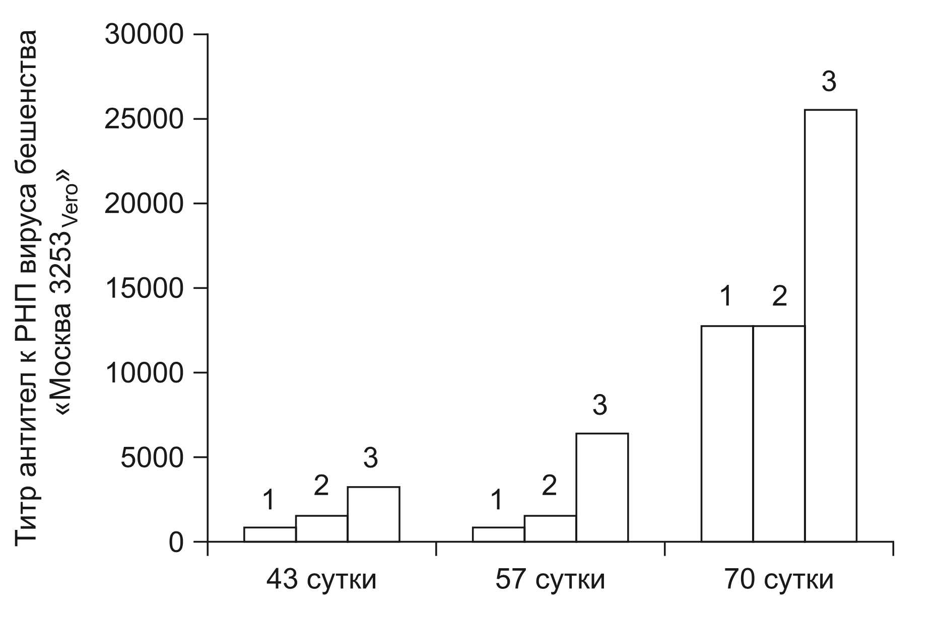 Титр антител к РНП вируса бешенства в образцах сыворотки крови животных трех экспериментальных групп на 43, 57 и 70 сутки от начала иммунизации. 1 — группа животных, иммунизированных РНП вируса бешенства штамма «Москва 3253Vero»; 2 — группа животных, иммунизированных РНП вируса бешенства штамма «Москва 3253Vero» в комплексе с адъювантом (полиоксидоний); 3 — группа животных, иммунизированных РНП вируса бешенства штамма «Москва 3253Vero» в комплексе с адъювантом (наночастицы коллоидного золота 0,1 моль/л)