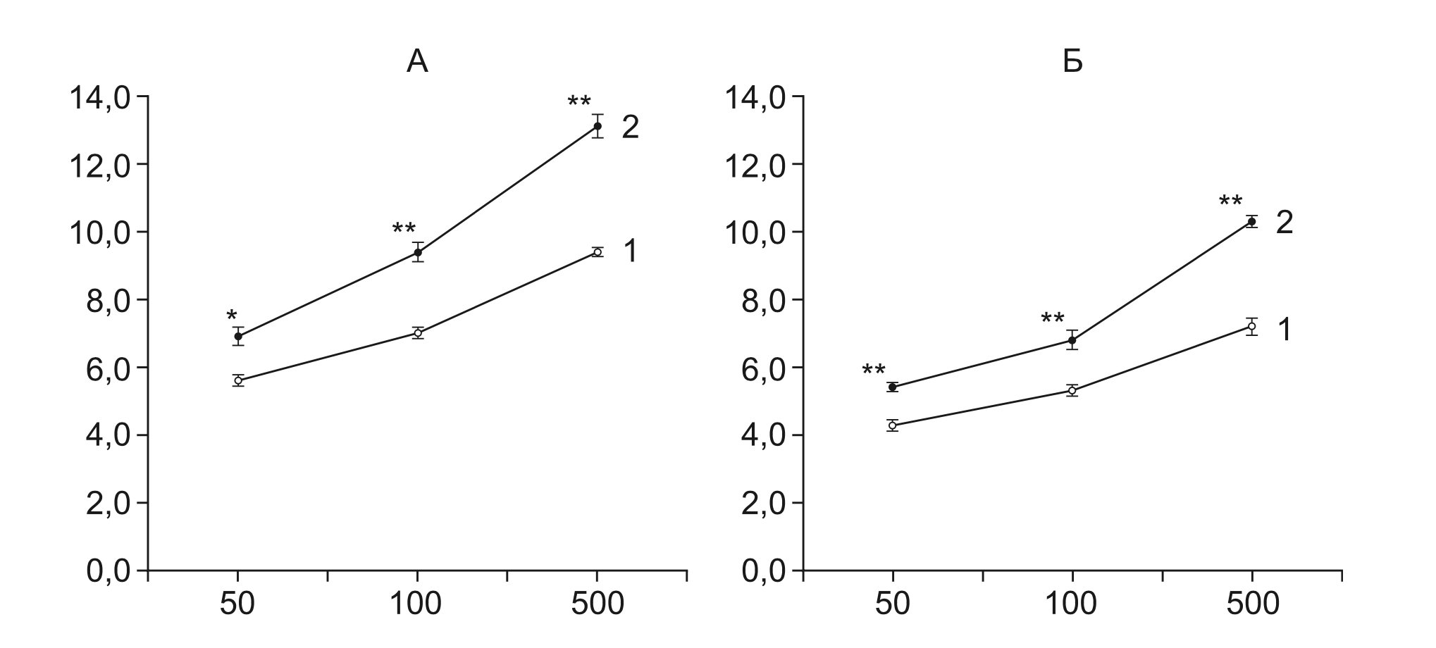 Торможение роста культуры (1) и ингибирование гемолитической активности (2) S.pyogenes в присутствии миллимолярных концентраций катионов цинка (M±m, n=18). По оси абсцисс: концентрация катионов цинка, мМ; по оси ординат: диаметр зоны регистрируемого эффекта, мм. А — водный сульфат цинка, Б — хлорид цинка. *p<0.01; **р<0.001 по сравнению с диаметром зоны задержки роста.