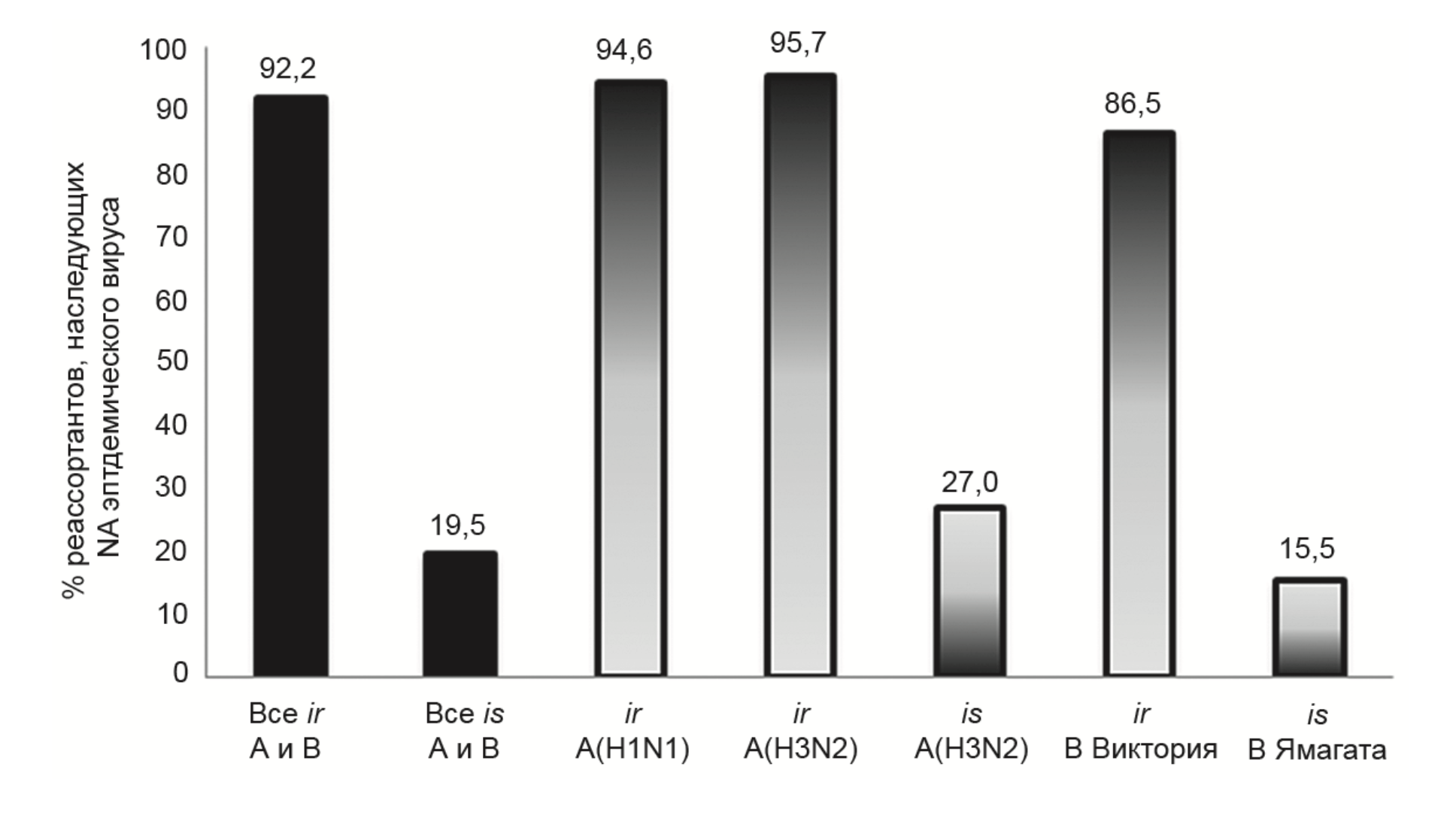 Рис.2. Наследование реассортантами нейраминидазы от эпидемического родителя при скрещивании с донорами аттенуации 118 ингибиторочувствительных (is) и 283 ингибитороустойчивых (ir) вирусов гриппа А и В (в % от общего количества реассортантов).