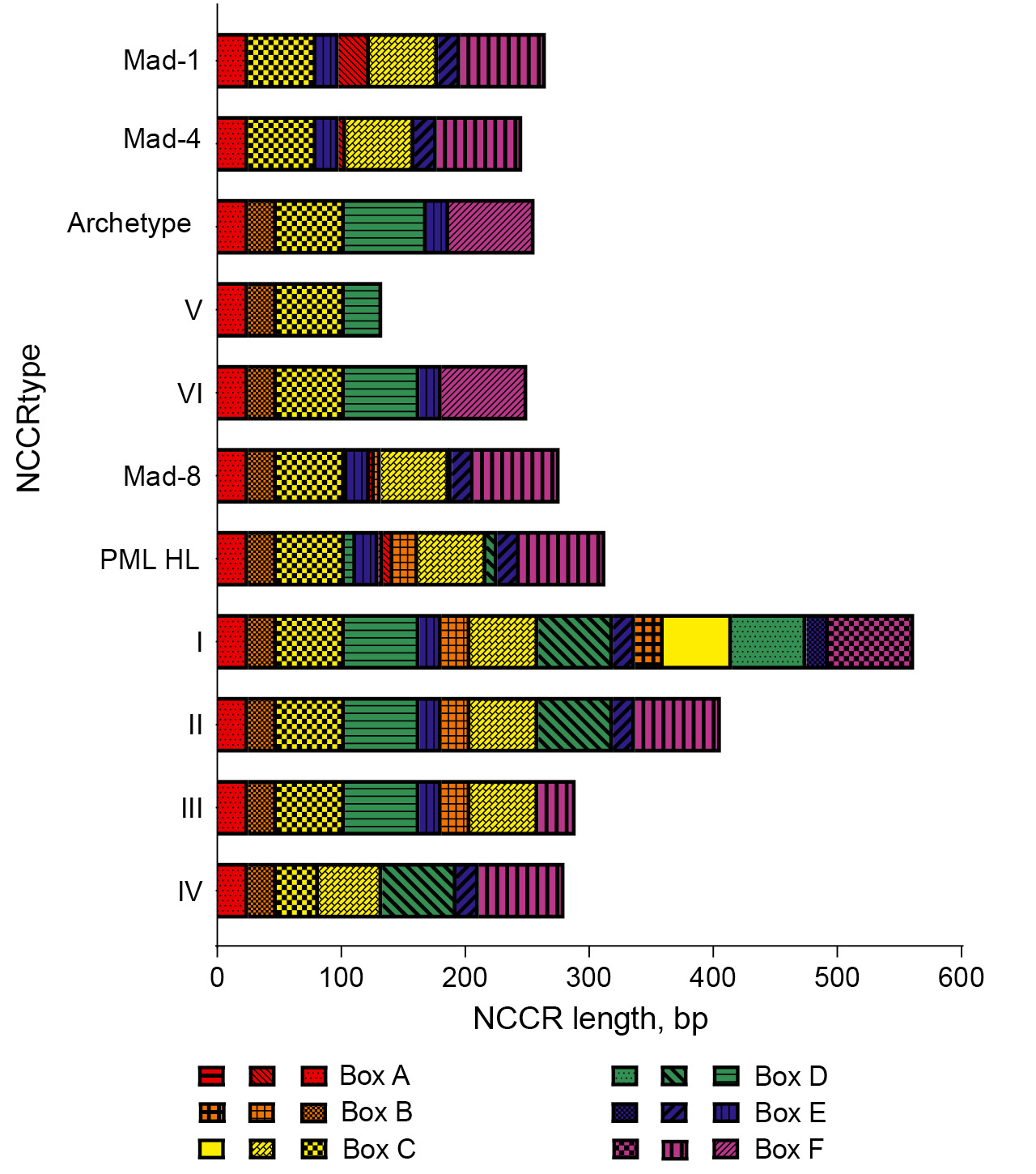 Results. A total of 48 NCCR sequences were found. The analysis showed that up to 55% of NCCRs were identified as rearranged NCCRs, while the other were archetype-like NCCRs. All the sequences can be divided into 6 types with one dominant rearrangement pattern. This rearranged NCCR was also found in a patient with the confirmed PML diagnosis and a poor prognosis. All the rearranged NCCRs were characterized by the presence of additional transcription factor binding sites.
