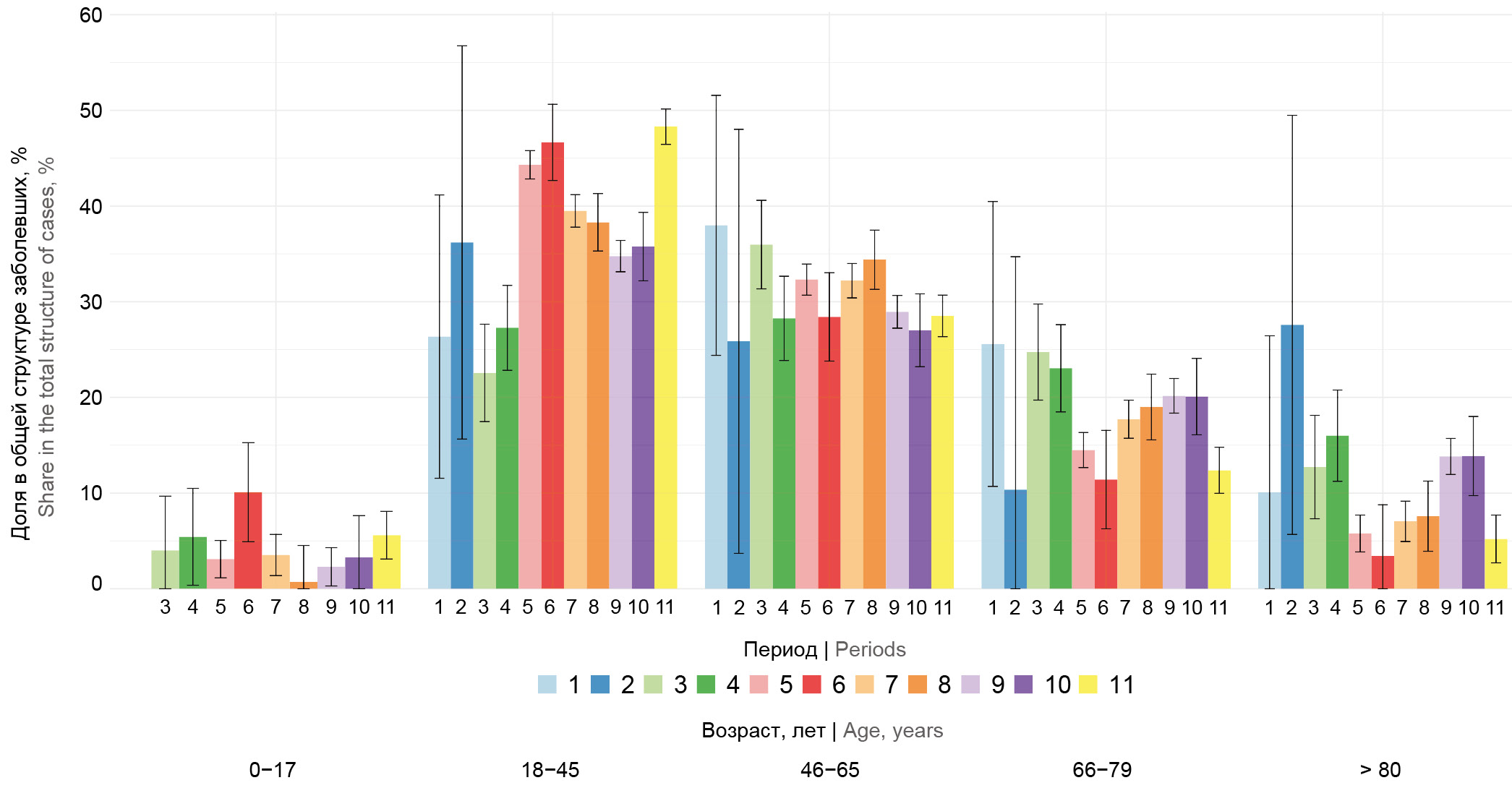 Наблюдения за первыми четырьмя периодами в целом не выявили достоверных изменений во вкладе в заболеваемость различных возрастных групп. Это может являться отражением процесса внедрения действовавших до января 2021 г. ограничительных мероприятий, при которых большое количество лиц трудоспособного возраста и учащихся переводилось на режим удалённой работы/учёбы. В периоды 5 и 6 наметились изменения структуры заболевших со смещением в более молодые возрастные группы. Удельный вес заболевших трудоспособного возраста (18–45 лет) был максимальным. В ходе пандемии медианный возраст заболевших снизился до 44 лет (межквартильный интервал: 31,5–60,9 года). Данное смещение, возможно, связано с ослаблением ограничительных мероприятий, появлением нового варианта SARS-CoV-2 на фоне низкого уровня популяционного иммунитета, недостаточного для сдерживания распространения вируса. В период 11 также отмечается увеличение удельного веса пациентов младше 46 лет. Это, возможно, связано со снижением эффективности программы вакцинации лиц младше 65 лет, снижением уровня коллективного иммунитета, отсутствием ограничительных мер, что послужило преимущественному включению в эпидемический процесс лиц трудоспособного возраста как более активной части населения.