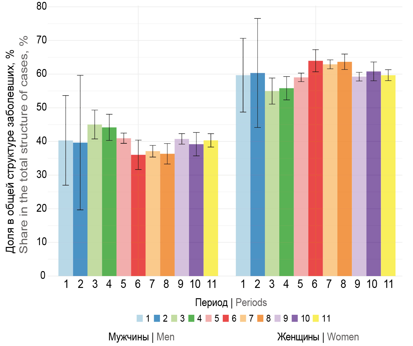 Среди заболевших пациентов начиная с периода 3 до конца наблюдения преобладали женщины — более 55% (p < 0,05; рис. 3).