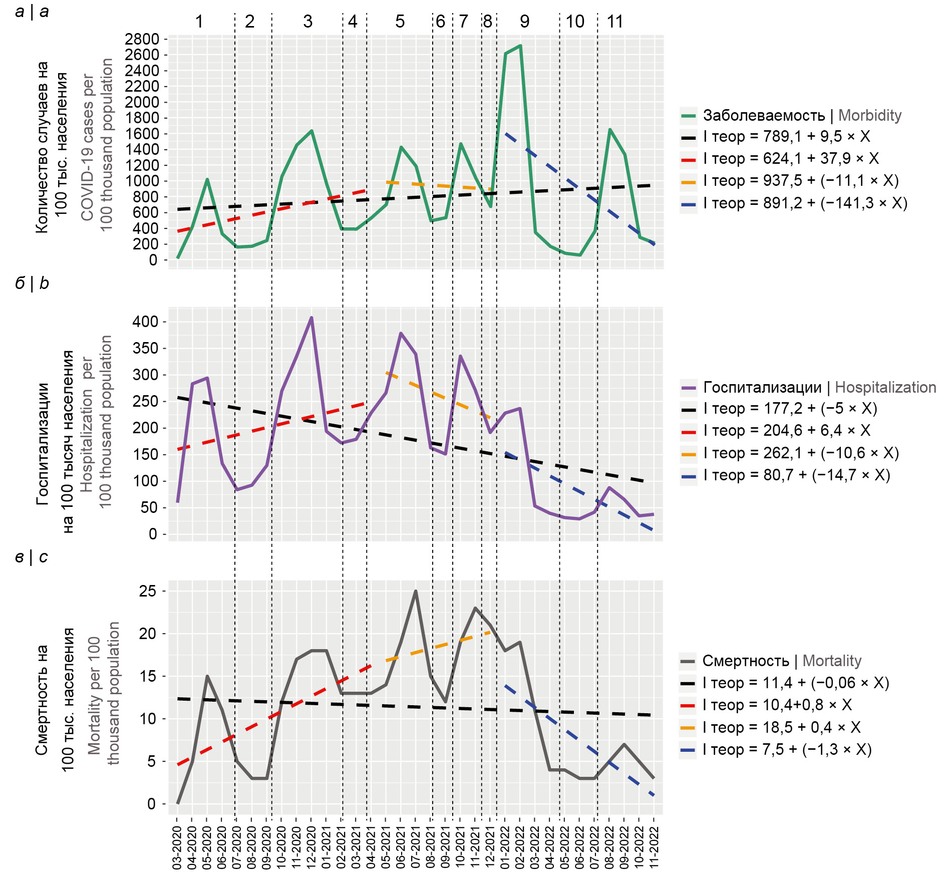За весь изучаемый период заболеваемость COVID-19 характеризовалась достоверной тенденцией к повышению заболеваемости и одновременно к снижению госпитализации и смертности (рис. 4). С учётом циклического характера динамики эпидемического процесса, а также неоднократной смены доминирующего варианта SARS-CoV-2 дополнительно были рассчитаны 3 линии тренда для диапазонов доминирования вариантов Ухань, Дельта и Омикрон. С самого начала пандемии на фоне этиологического агента COVID-19 варианта Ухань (январь 2020 г. — апрель 2021 г.) отмечалась достоверная тенденция к росту всех 3 изучаемых в работе эпидемиологических показателей. В период доминирования варианта Дельта (май 2021 г. — декабрь 2021 г.) сохранялся достоверный тренд к росту смертности на фоне стабилизации среднего уровня заболеваемости (нет достоверной тенденции к изменению заболеваемости) и достоверной смене направления тенденции случаев госпитализации населения. Во время доминирования варианта Омикрон (январь 2022 г. — ноябрь 2022 г.) динамика всех 3 показателей характеризовалась достоверной тенденцией к снижению.