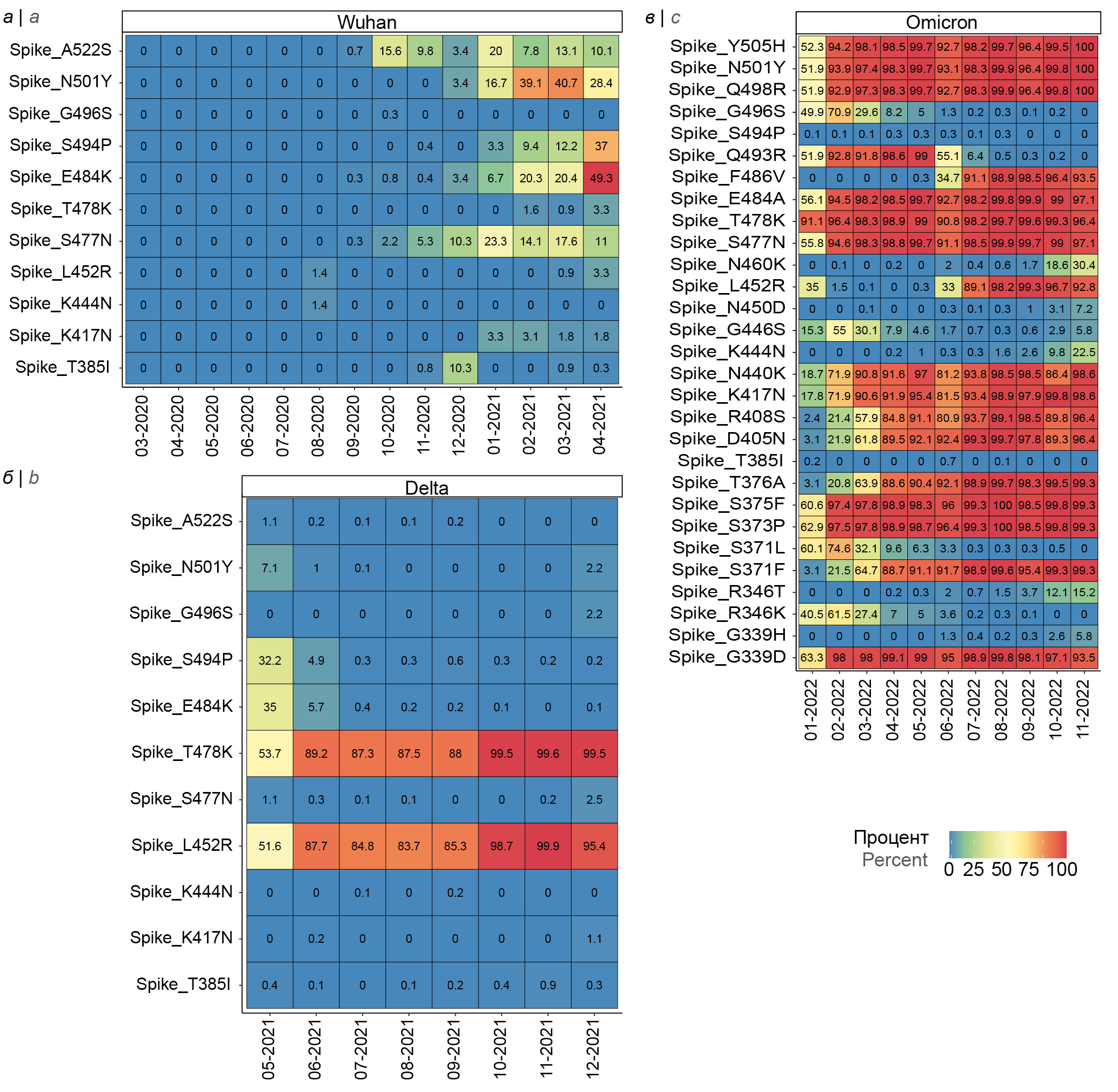 Рис. 5. Помесячная динамика мутаций в рецептор-связывающем домене (RBD) Spike белка у различных вариантов SARS-CoV-2 Ухань (а), Дельта (б) и Омикрон (в). По оси ординат — основные мутации.